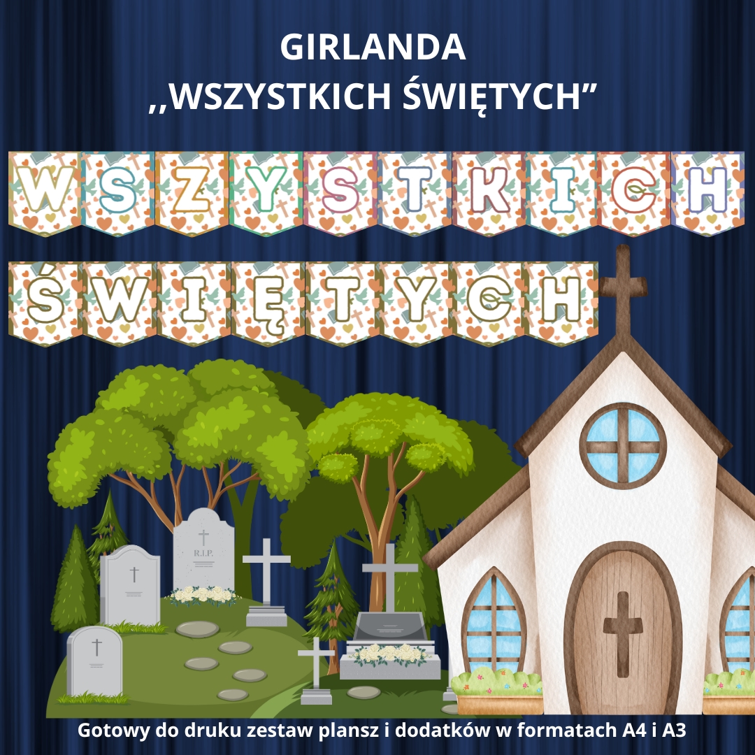 Girlanda z napisem „Wszystkich Świętych” to elegancka i stonowana dekoracja, która wprowadzi do sali lekcyjnej lub przedszkolnej spokojny, podniosły nastrój podczas obchodów Uroczystości Wszystkich Świętych. Jej subtelny wygląd podkreśli wyjątkowość dnia i stworzy estetyczne tło dla zajęć oraz rozmów o tradycjach tego święta.