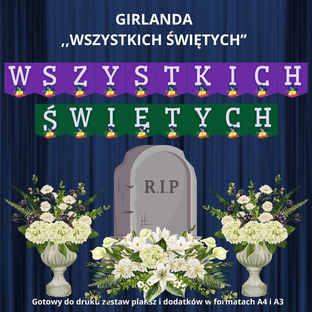 Girlanda z napisem „Wszystkich Świętych” to wyjątkowa dekoracja, która wprowadzi do sali lekcyjnej lub przedszkolnej spokojny i podniosły nastrój podczas obchodów Uroczystości Wszystkich Świętych. Doda elegancji, a jednocześnie stanie się subtelnym, ale efektownym akcentem podkreślającym znaczenie tego dnia.