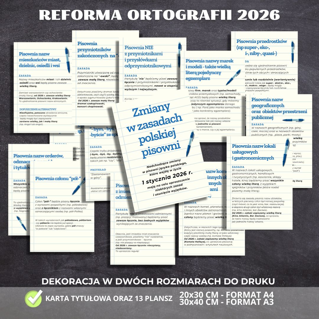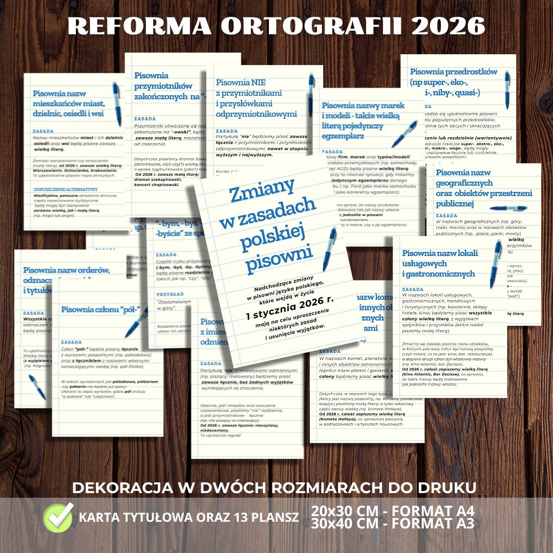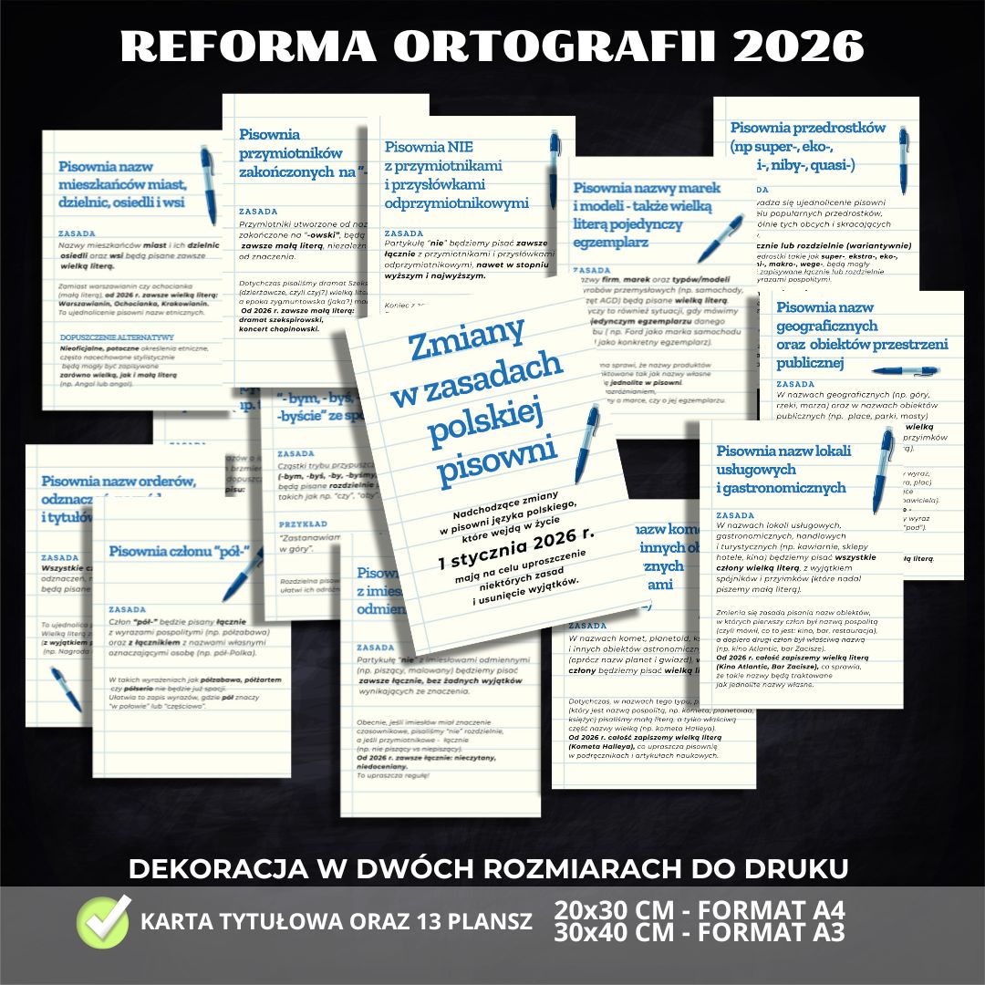 Zestaw składa się z karty tytułowej oraz 13 plansz edukacyjnych w formacie A4 i A3, informujących o reformie ortografii, która wchodzi w życie z dniem 1 stycznia 2026 roku.