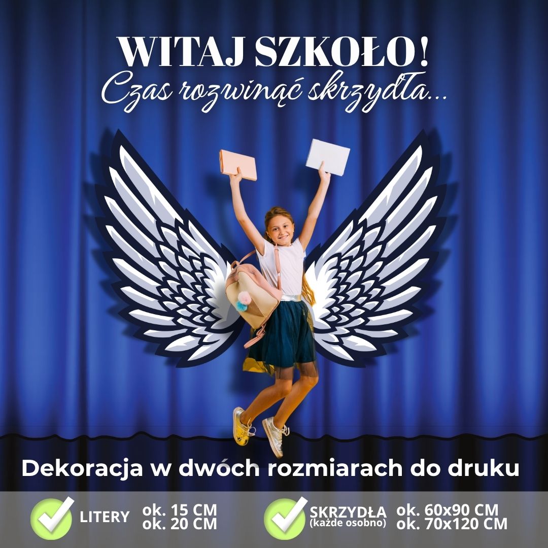 Po zawieszeniu na ścianie skrzydła tworzą niezwykłe tło do zdjęć – wystarczy, że dziecko stanie między nimi, by wyglądało, jakby miało je naprawdę! To nie tylko wspaniała pamiątka, ale też symbol gotowości do nowych wyzwań, marzeń i szkolnych przygód. Dekoracja dostępna jest w wygodnym formacie PDF do samodzielnego wydruku. Kilka chwil i gotowe – efekt robi wrażenie, a przygotowanie jest dziecinnie proste!