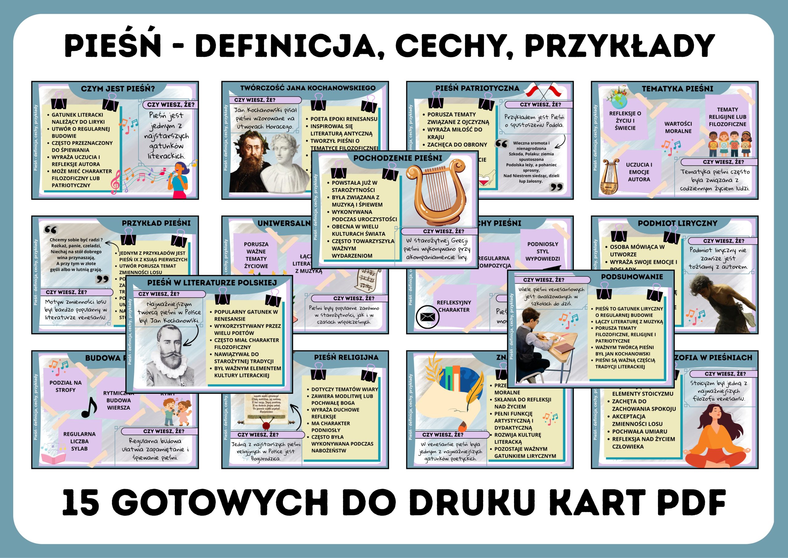 ✨ Przejrzysta forma, atrakcyjna szata graficzna i wartościowa treść sprawiają, że uczniowie chętnie poznają świat pieśni i jej znaczenie w literaturze! Postaw na wygodę i jakość – wydrukuj, zawieś i ucz z przyjemnością!