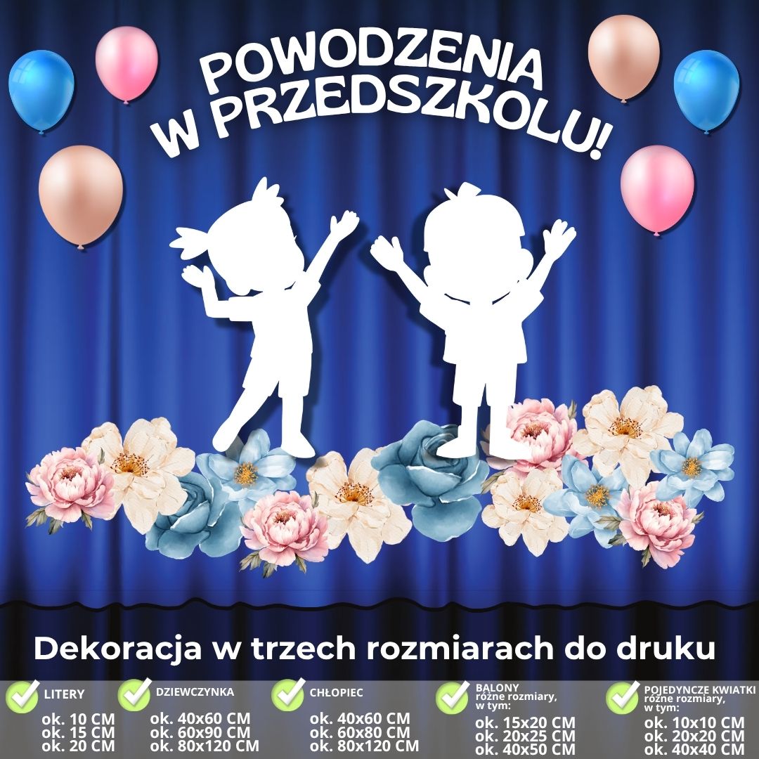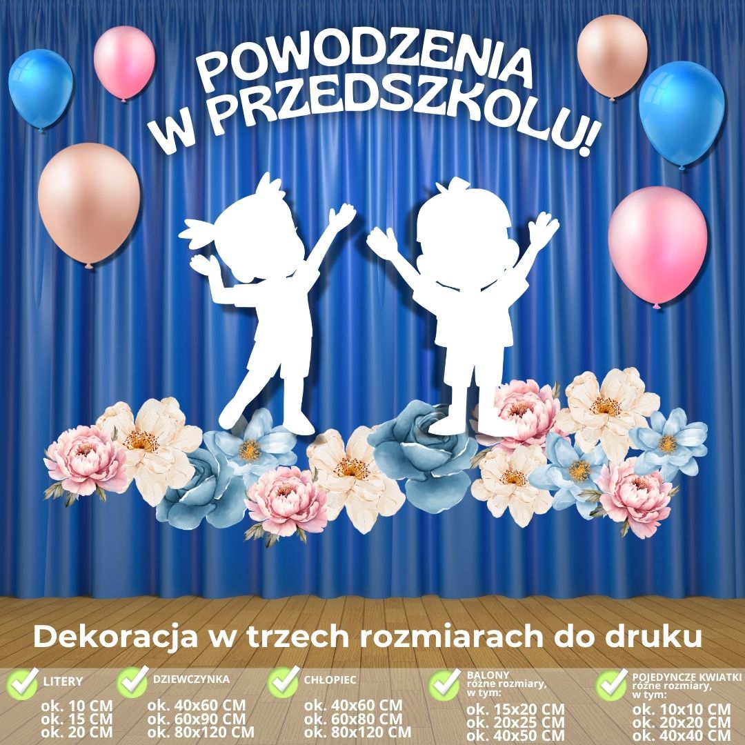 - balony (3 wersje kolorystyczne) – ok. 40 × 50 cm (każdy składa się z 4 stron A4),