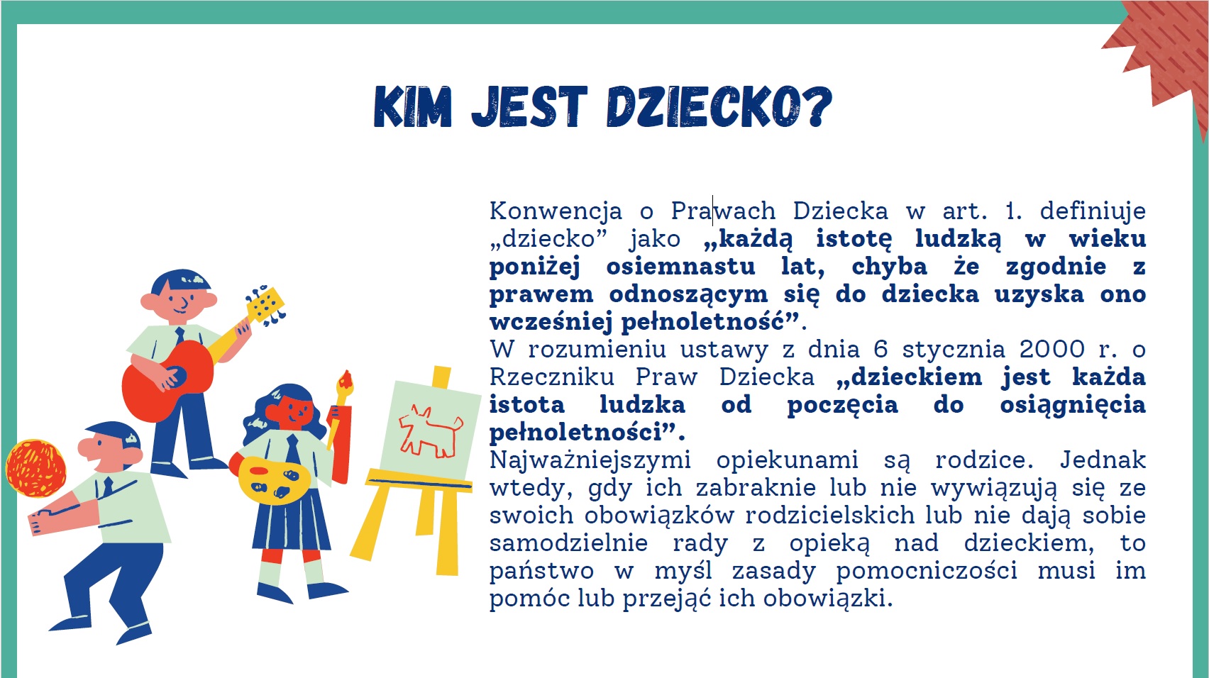 Prawa dziecka oznaczają, że każde dziecko – niezależnie od koloru skóry, pochodzenia, języka, religii, płci czy stanu zdrowia – ma takie same prawa. Do najważniejszych praw dziecka należą m.in.: