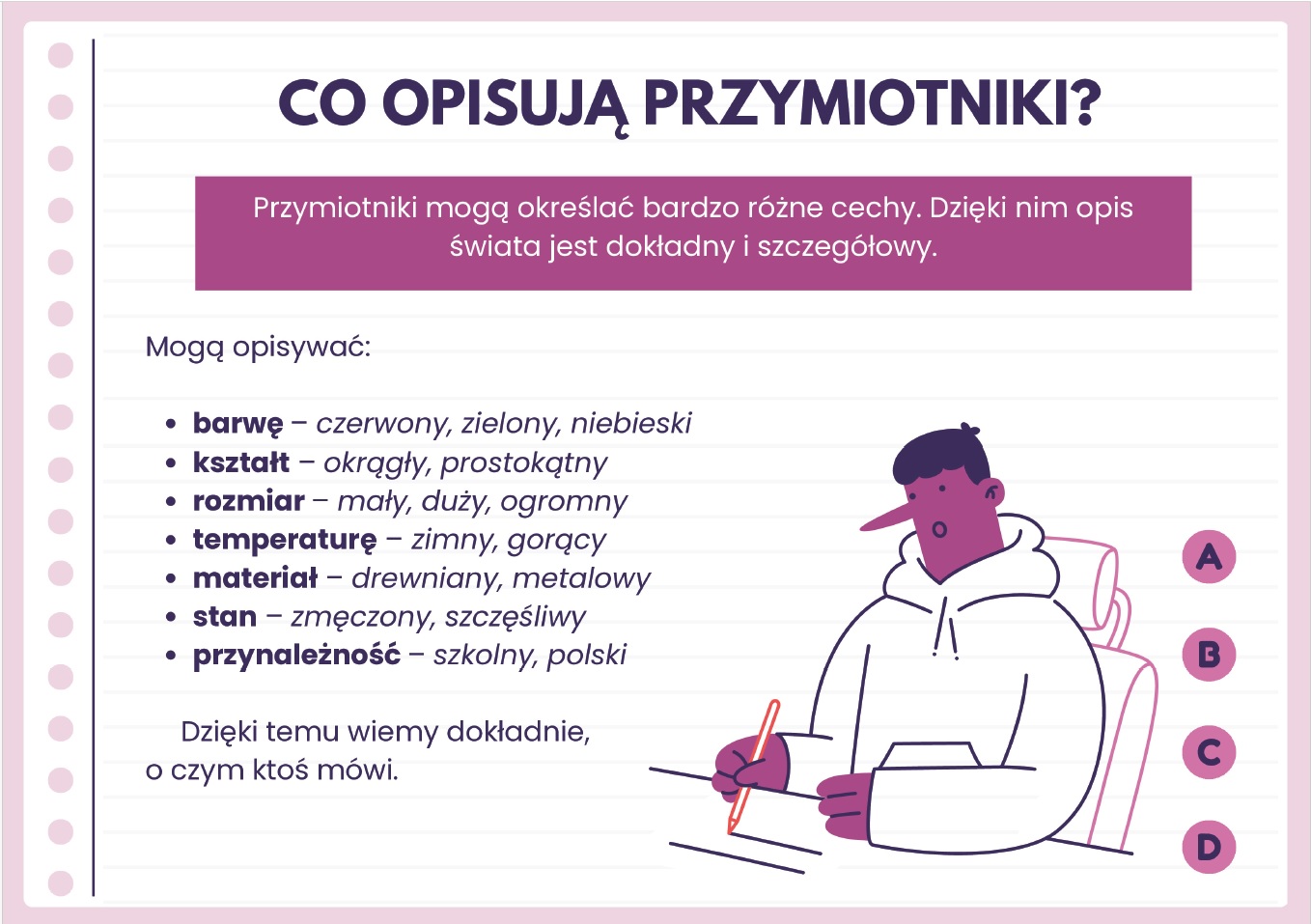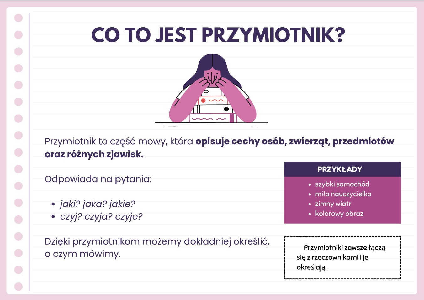 Przymiotniki to części mowy, które określają cechy osób, zwierząt, rzeczy, miejsc lub zjawisk. Odpowiadają najczęściej na pytania: jaki? jaka? jakie? czyj? który? Dzięki nim możemy dokładniej opisać rzeczownik, na przykład: czerwony samochód, miła koleżanka, wysokie drzewo.