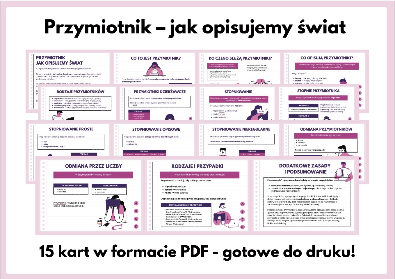 Przygotowaliśmy gazetkę szkolną o przymiotnikach, która w prosty i atrakcyjny sposób pomaga uczniom zrozumieć tę część mowy. Moja gazetka  zawiera aż 15 kart PDF, gotowych do wydruku i wykorzystania podczas lekcji lub jako dekoracja sali. To praktyczny i estetyczny materiał, który świetnie sprawdzi się w każdej klasie.