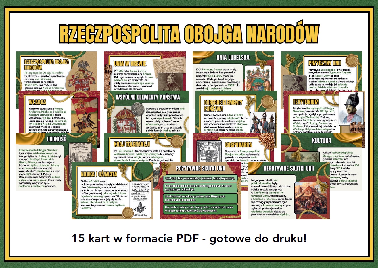 Przygotowałam gazetkę szkolną o Rzeczypospolitej Obojga Narodów, która w ciekawy i przejrzysty sposób przybliża uczniom historię wspólnego państwa Polski i Litwy. Zestaw składa się z aż 15 kart PDF, dzięki czemu świetnie sprawdzi się jako pomoc dydaktyczna oraz efektowna dekoracja sali lekcyjnej.