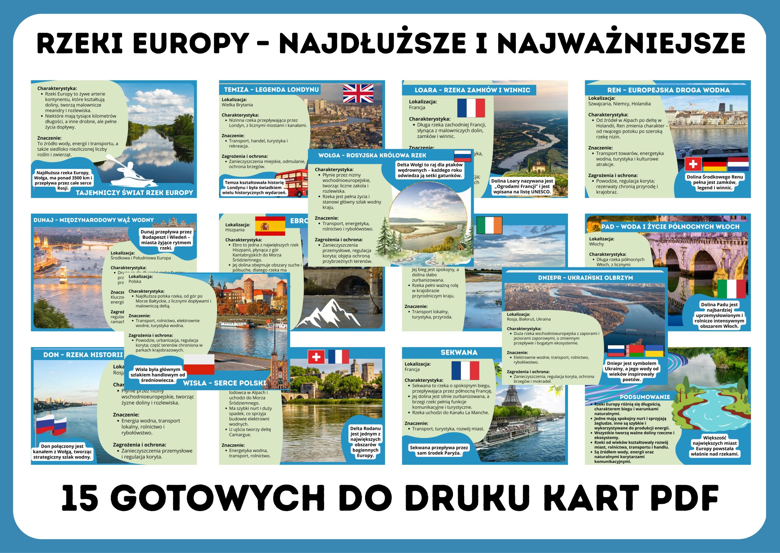 Uczniowie poznają m.in. Wołga, Dunaj czy Ren, a kolorowe plansze ułatwiają zapamiętywanie i rozumienie treści. To praktyczne i efektowne wsparcie każdej lekcji o Europie!
