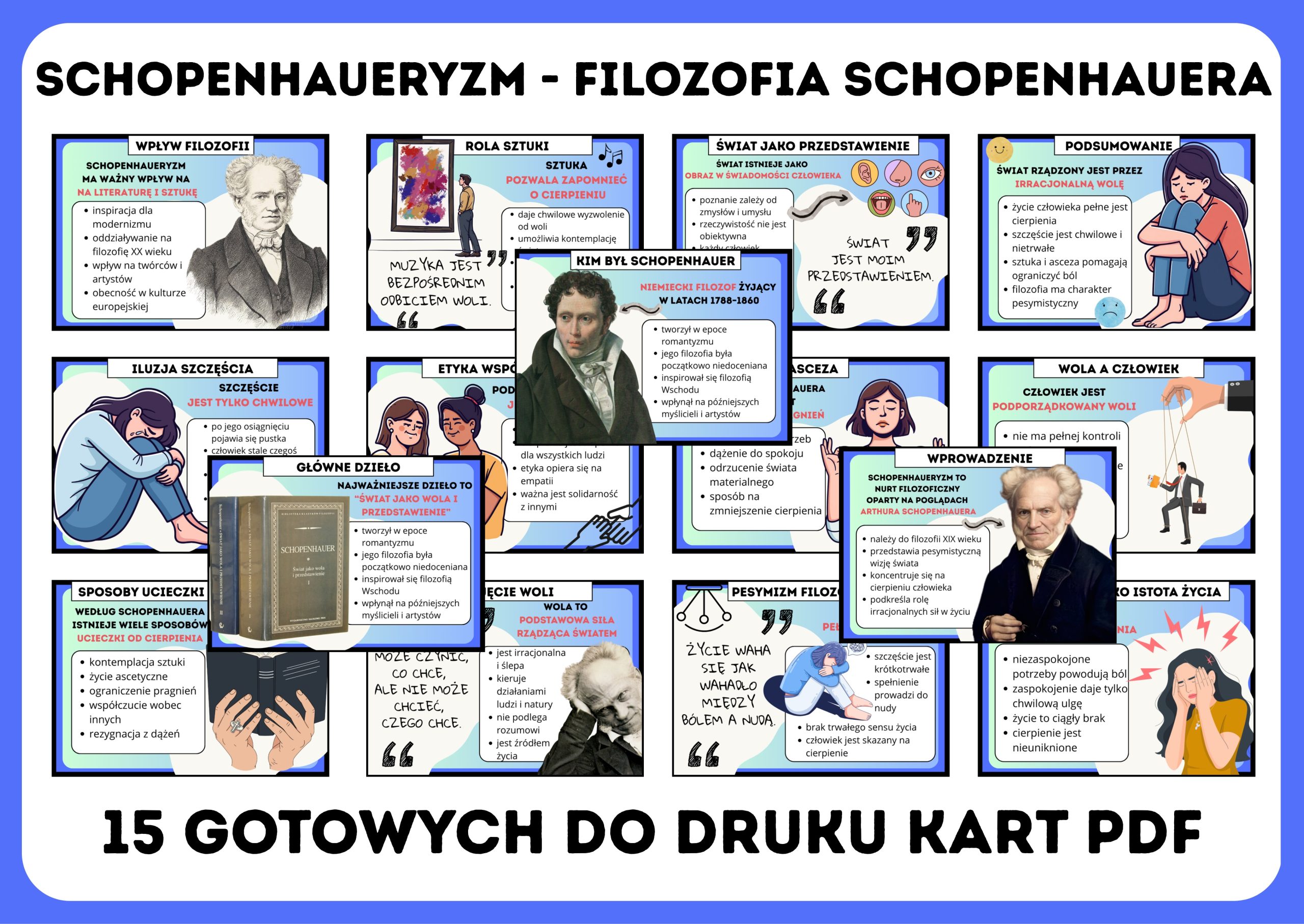 Przygotuj ciekawą gazetkę szkolną o schopenhaueryzmie i pomóż uczniom lepiej zrozumieć jedną z ważnych filozofii omawianych na lekcjach języka polskiego! Zestaw zawiera aż 15 kart PDF, które w przejrzysty i atrakcyjny sposób wyjaśniają główne założenia filozofii Schopenhauera, jej cechy oraz wpływ na literaturę i kulturę.