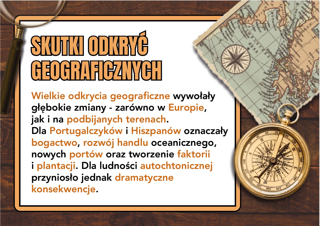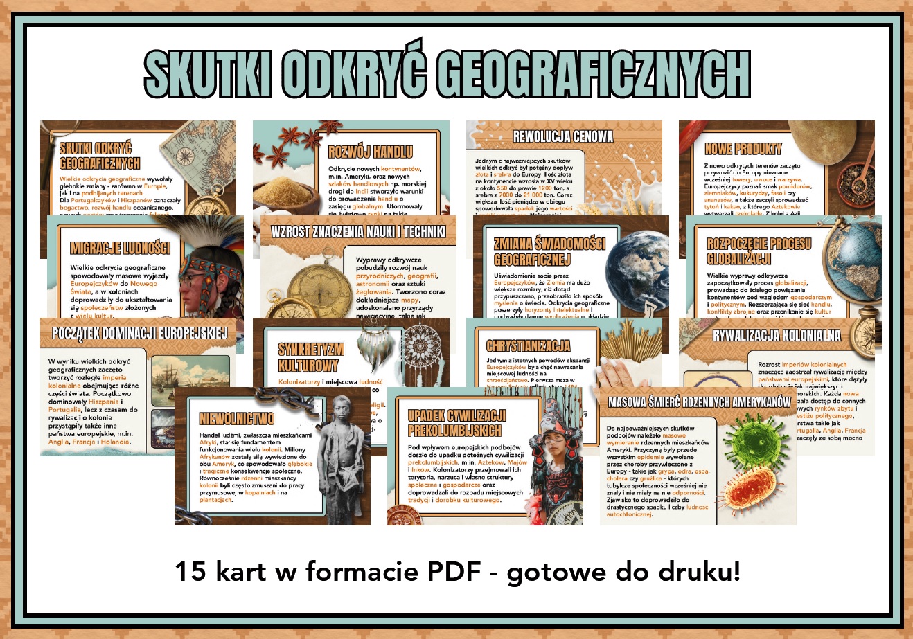 Przygotuj dla swoich uczniów atrakcyjną i nowoczesną gazetkę szkolną poświęconą skutkom odkryć geograficznych 🌍 Zestaw 15 kart w formacie PDF w przystępny sposób wyjaśnia, jak wielkie wyprawy zmieniły świat – od rozwoju handlu i nauki, po kolonizację i jej konsekwencje społeczne.
