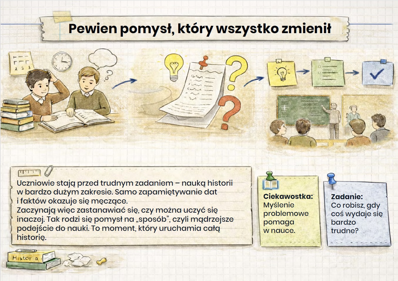 Chłopcy, zamiast solidnie się uczyć, kombinują, jak przechytrzyć nauczyciela i uniknąć złych ocen. Z czasem jednak odkrywają, że ich nauczyciel wcale nie jest wrogiem, a historia może być ciekawa, jeśli ktoś potrafi o niej pasjonująco opowiadać. Sprytne plany uczniów prowadzą do zabawnych sytuacji, ale też do ważnych refleksji o nauce, odpowiedzialności i relacjach międzyludzkich.