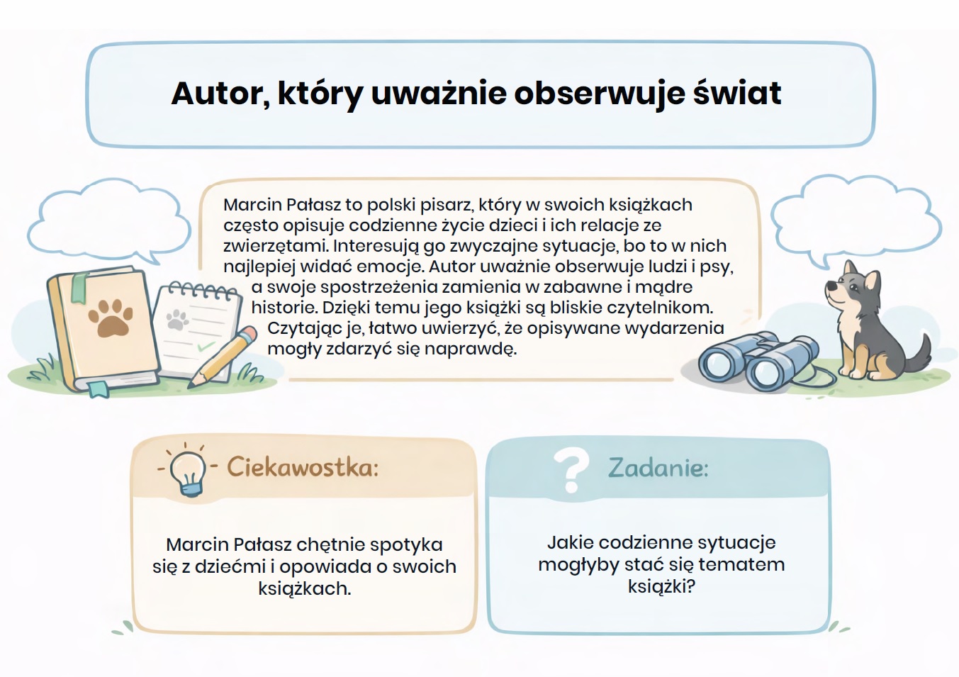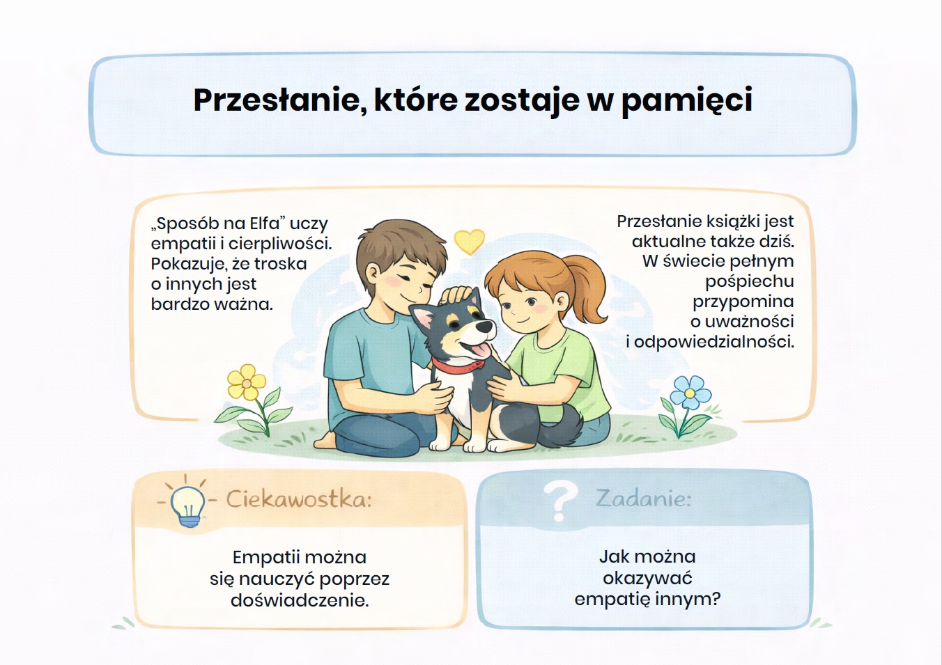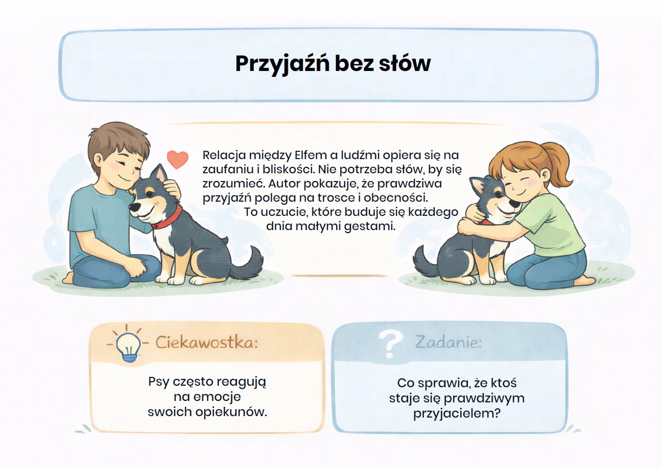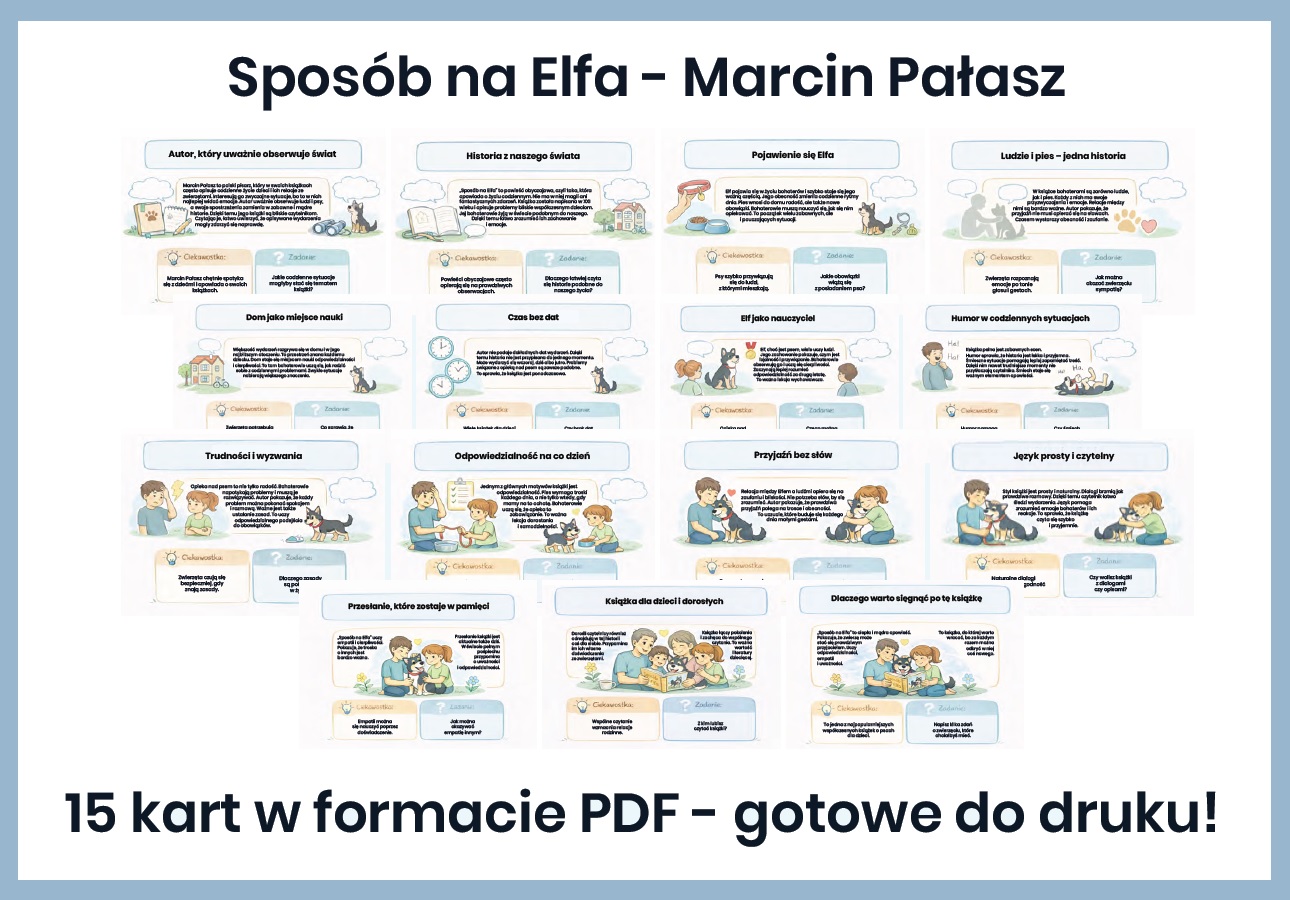 „Sposób na Elfa” – gazetka szkolna (aż 15 kart PDF). Gotowa gazetka szkolna inspirowana lekturą „Sposób na Elfa” w przystępnej, przyjaznej formie przybliża uczniom historię niezwykłego psa Elfa oraz jego relację z ludźmi – pełną humoru, ciepła i wzruszeń.