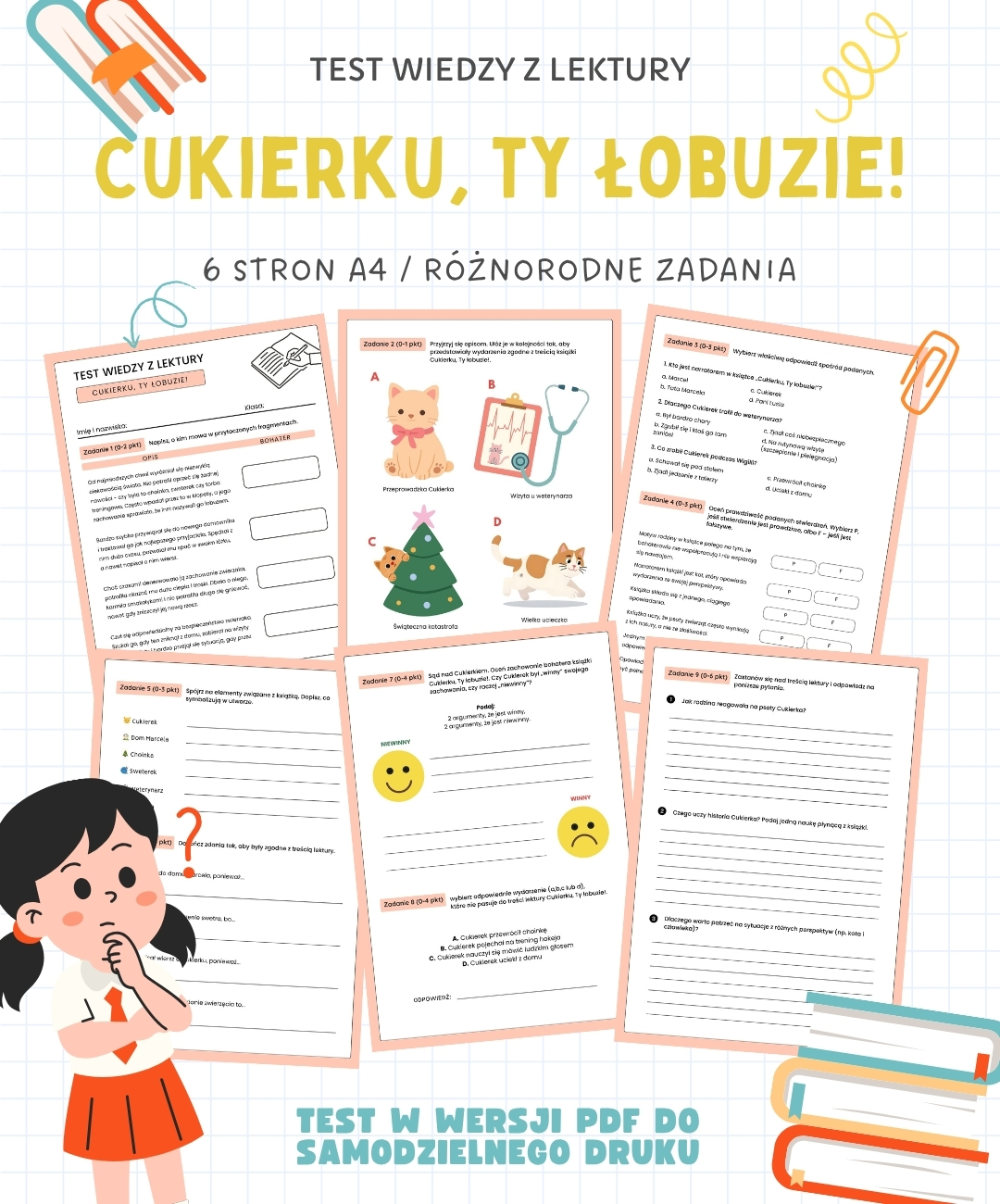 📘 Test z lektury „Cukierku, ty łobuzie” – gotowy do druku (PDF). Przygotowałam test z lektury „Cukierku, ty łobuzie”, który stanowi świetny materiał do sprawdzenia wiedzy uczniów po omówieniu tej zabawnej i pełnej ciepła książki. Test składa się z 6 stron A4 w formacie PDF i zawiera różnorodne zadania dotyczące fabuły, bohaterów oraz najważniejszych wydarzeń.