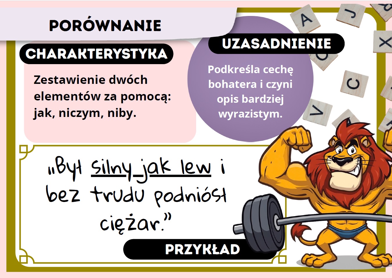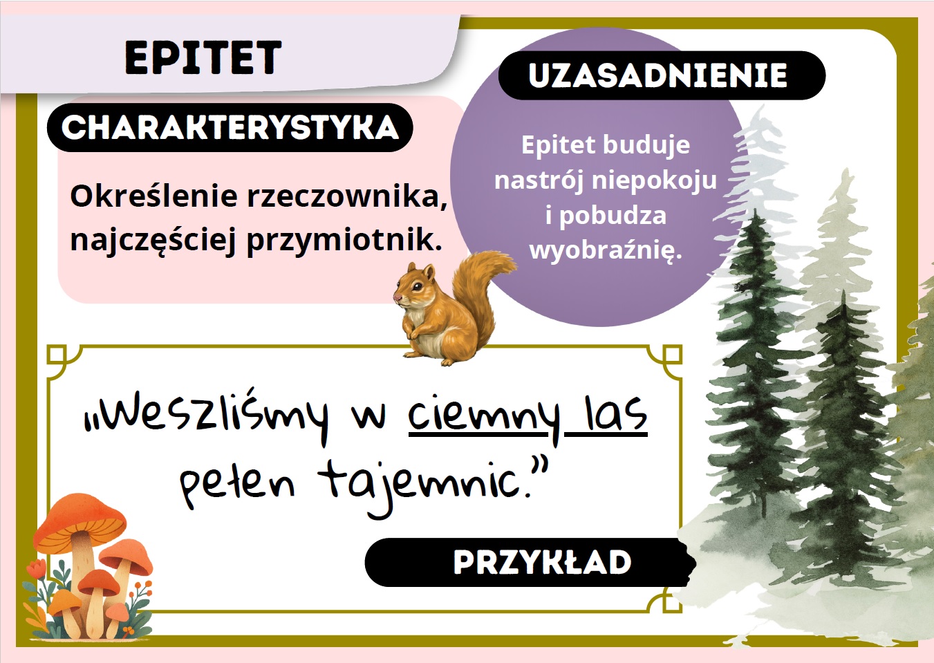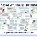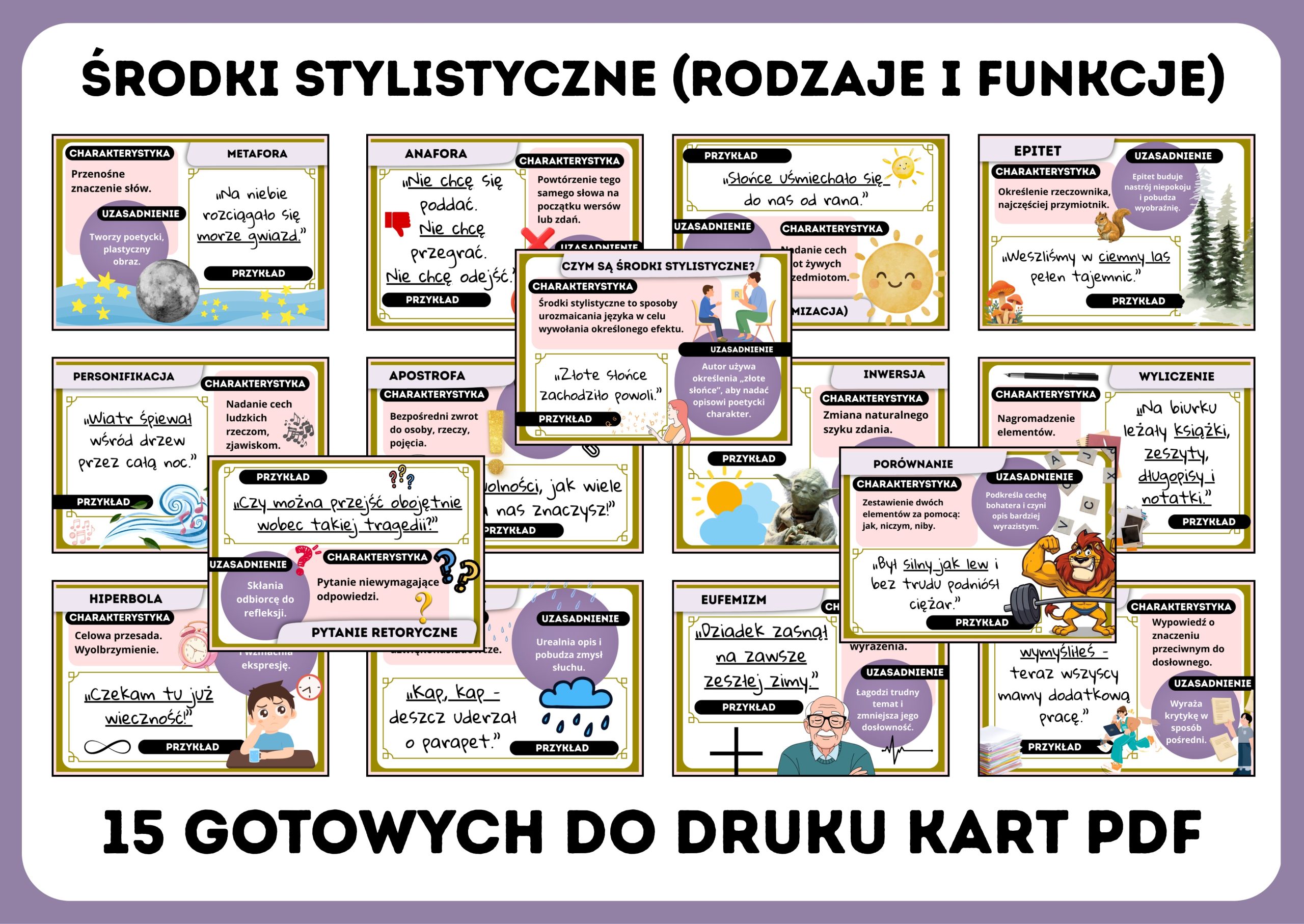 W mojej gazetce znajdziesz aż 15 kart PDF gotowych do wydruku – z przejrzystymi definicjami, przykładami i czytelnymi schematami. Uczniowie poznają m.in. epitet, metaforę, porównanie, uosobienie, wyliczenie, powtórzenie i inne ważne środki stylistyczne. Materiał świetnie sprawdzi się jako gazetka ścienna, plansze dydaktyczne lub stała pomoc w klasie.