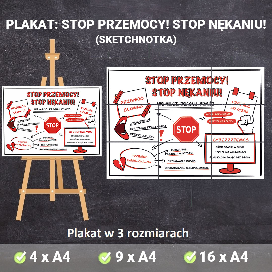 🖼️ Plakat „Stop Przemocy – Stop Nękaniu” dostępny w 3 wielkościach (4xA4, 9xA4, 16xA4) – idealny do klas, korytarzy, świetlic i gabinetów pedagoga. Sketchnotka przekazuje ważny komunikat w prosty, wizualny sposób.