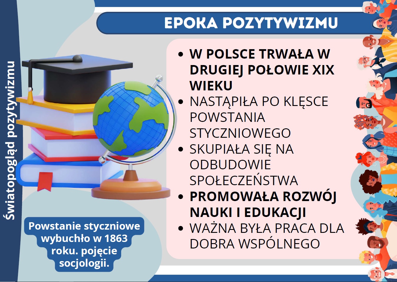 Uczniowie poznają takie pojęcia jak praca u podstaw, praca organiczna, rozwój nauki czy znaczenie edukacji. Materiał został przygotowany w atrakcyjnej formie graficznej, dzięki czemu świetnie sprawdzi się jako dekoracja klasy, pomoc dydaktyczna lub element gazetki tematycznej.