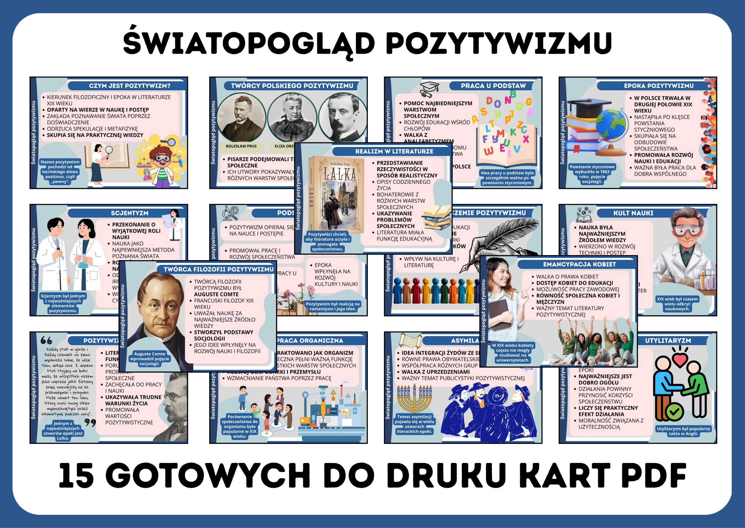 Zestaw zawiera aż 15 starannie opracowanych kart w formacie PDF, które w przystępny sposób wyjaśniają, czym był światopogląd pozytywizmu oraz jakie idee mu towarzyszyły.