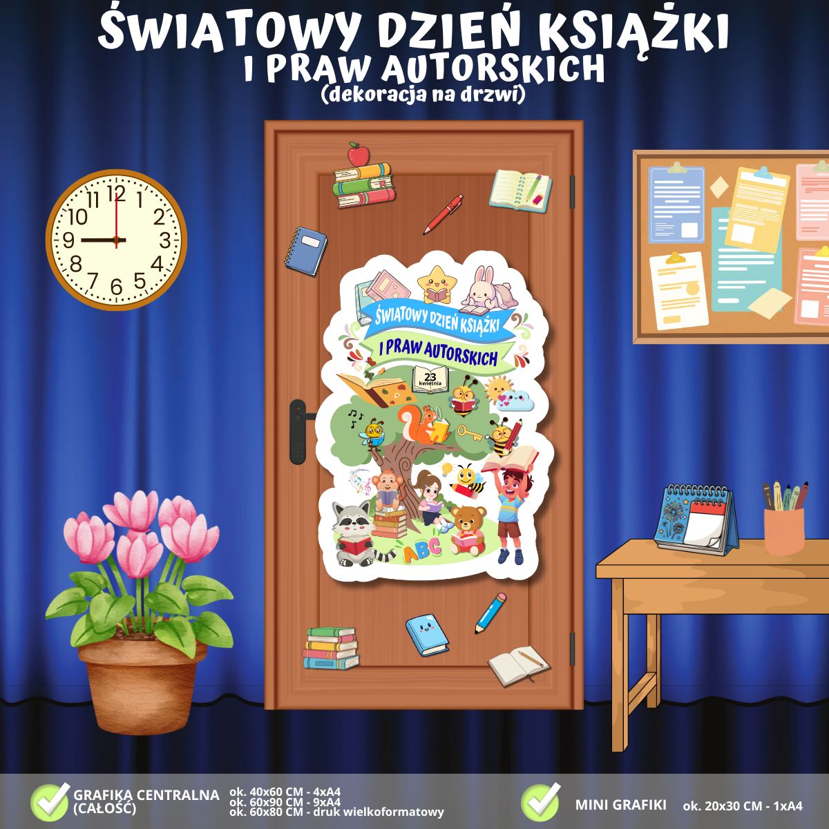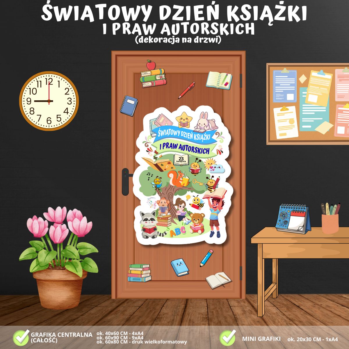 Zadbaj o radosną i inspirującą oprawę czytelniczego święta w Twojej szkole! Nasza dekoracja na drzwi to kolorowe połączenie edukacji z literacką przygodą, która zaprasza uczniów do świata wyobraźni i zamienia wejście do sali w bramę do krainy opowieści: