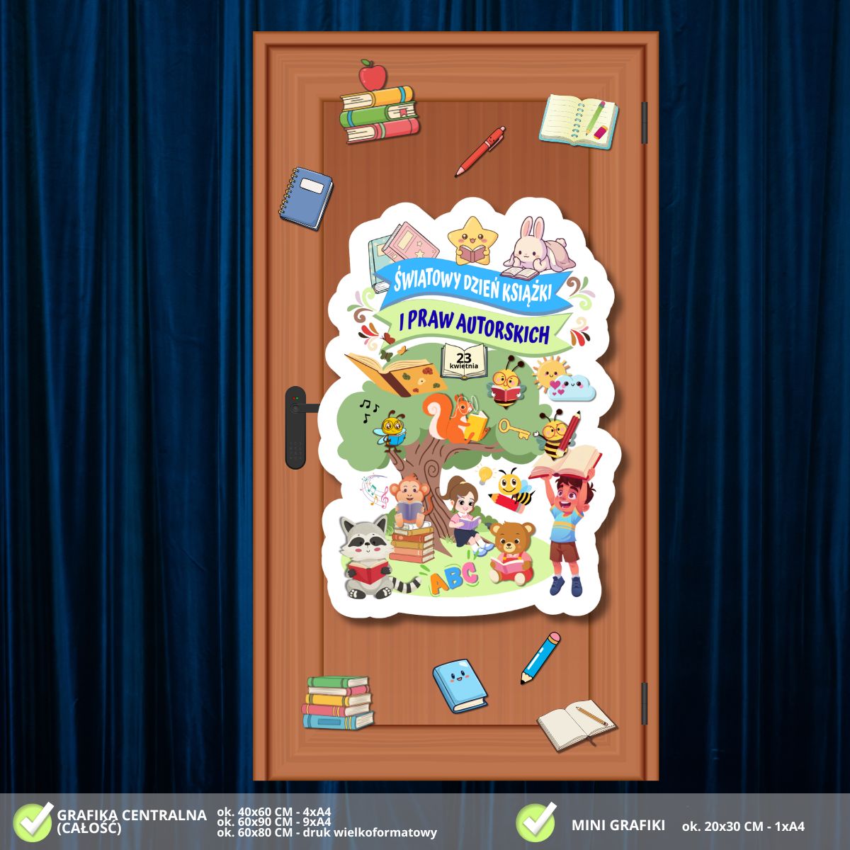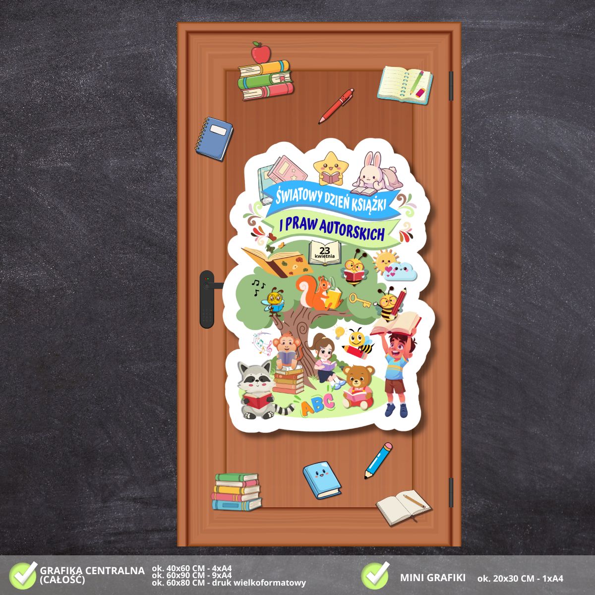 - Elementy dopełniające – Przybory szkolne i książki: Zestaw zawiera dodatkowe grafiki przedstawiające kolorowe stosy książek, otwarte notesy, ołówki oraz jabłko. Te radosne atrybuty nauki i twórczości można dowolnie rozmieścić wokół głównego plakatu, tworząc dynamiczną i spójną kompozycję na całych drzwiach.