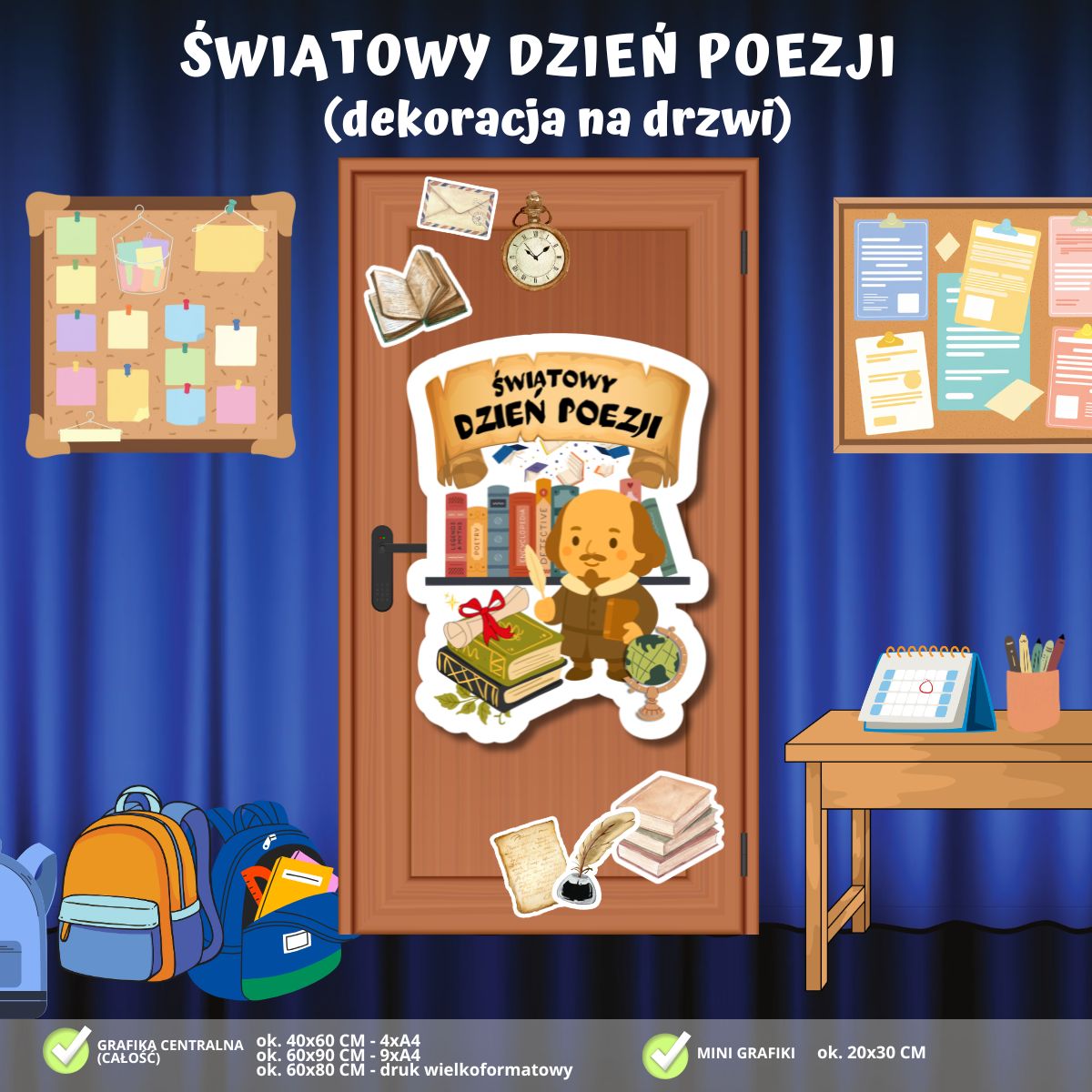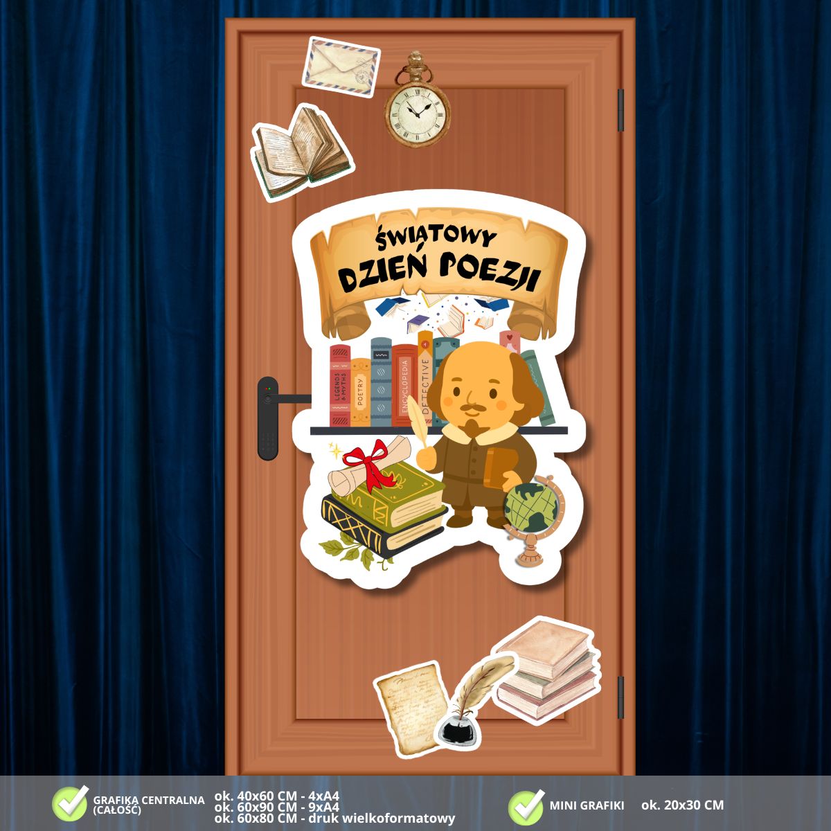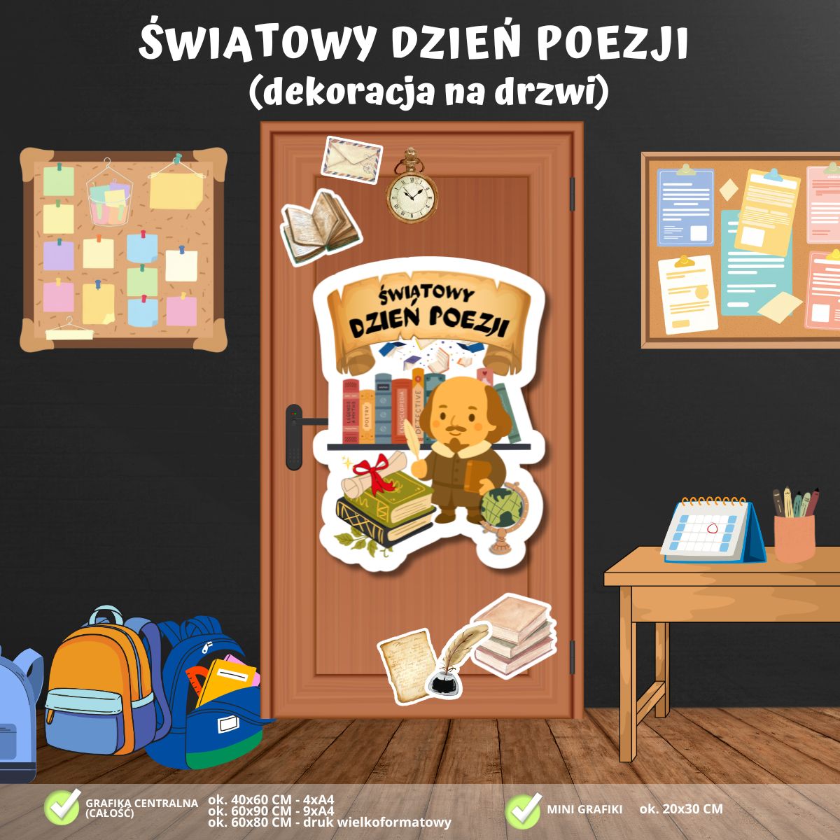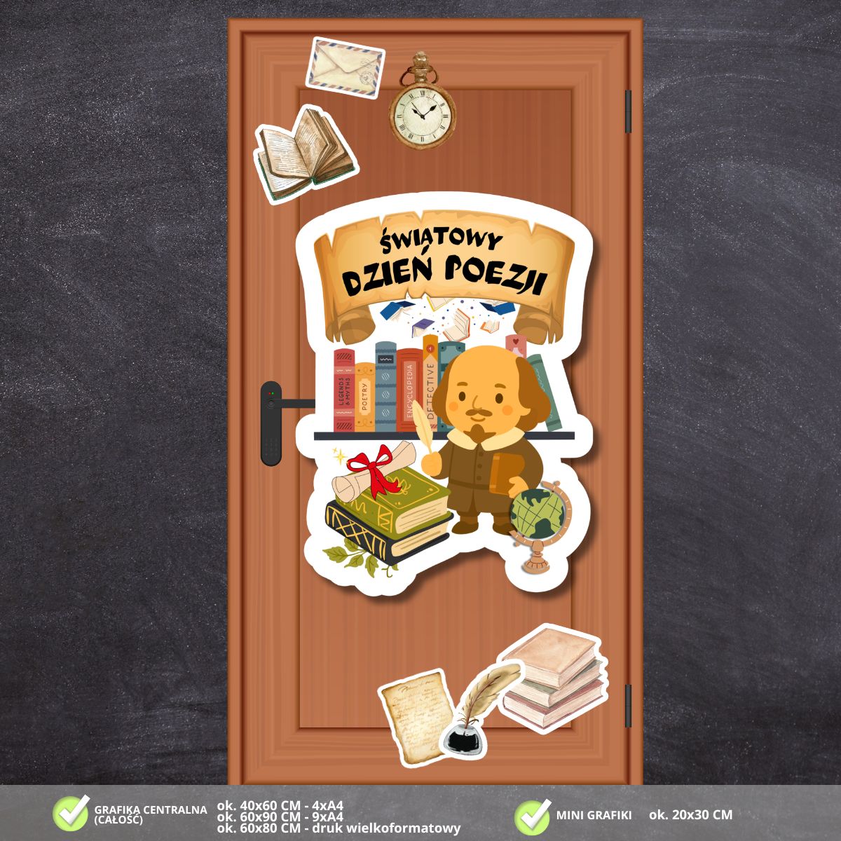Zadbaj o inspirujący i edukacyjny wystrój w swojej klasie! Nasza najnowsza dekoracja na drzwi to połączenie klimatycznych ilustracji z motywem literatury, który zabierze uczniów w fascynującą podróż do świata poezji i wyobraźni: