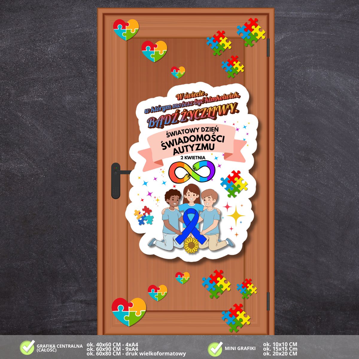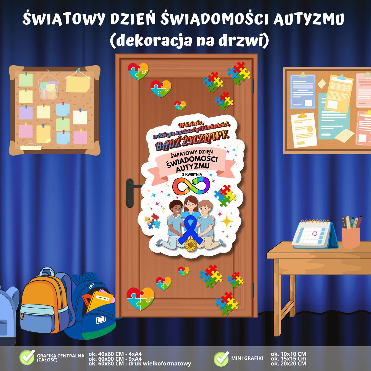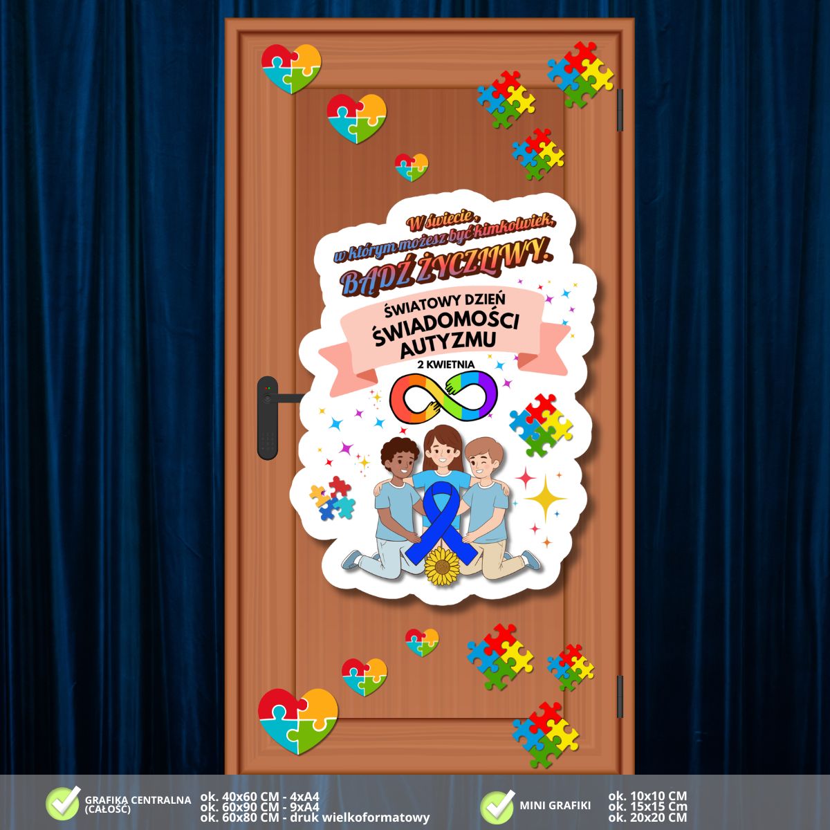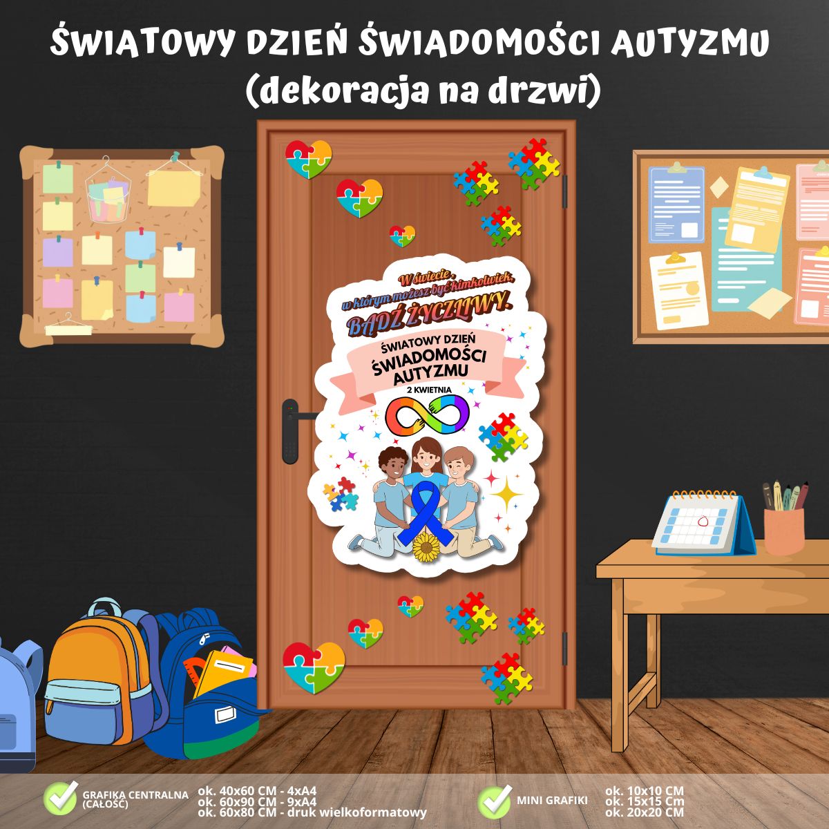 Zadbaj o wyjątkowy i wartościowy wystrój w swojej klasie! Nasza najnowsza dekoracja na drzwi to połączenie radosnego świętowania z edukacyjną ilustracją, która przybliża tematykę spektrum autyzmu w przyjazny sposób i zamieni wejście do sali w krainę empatii: