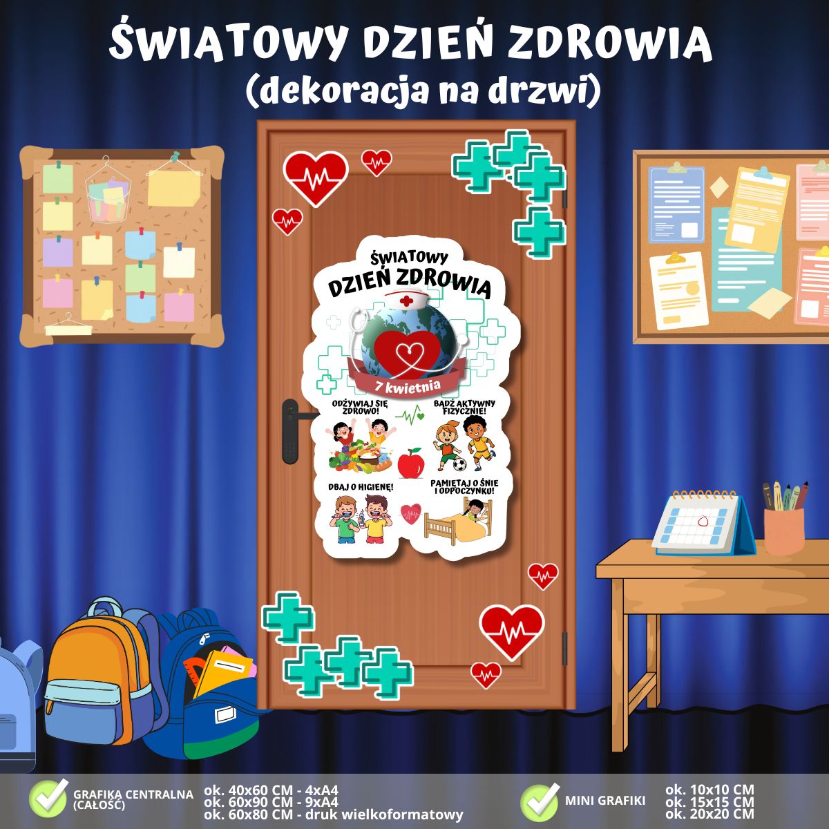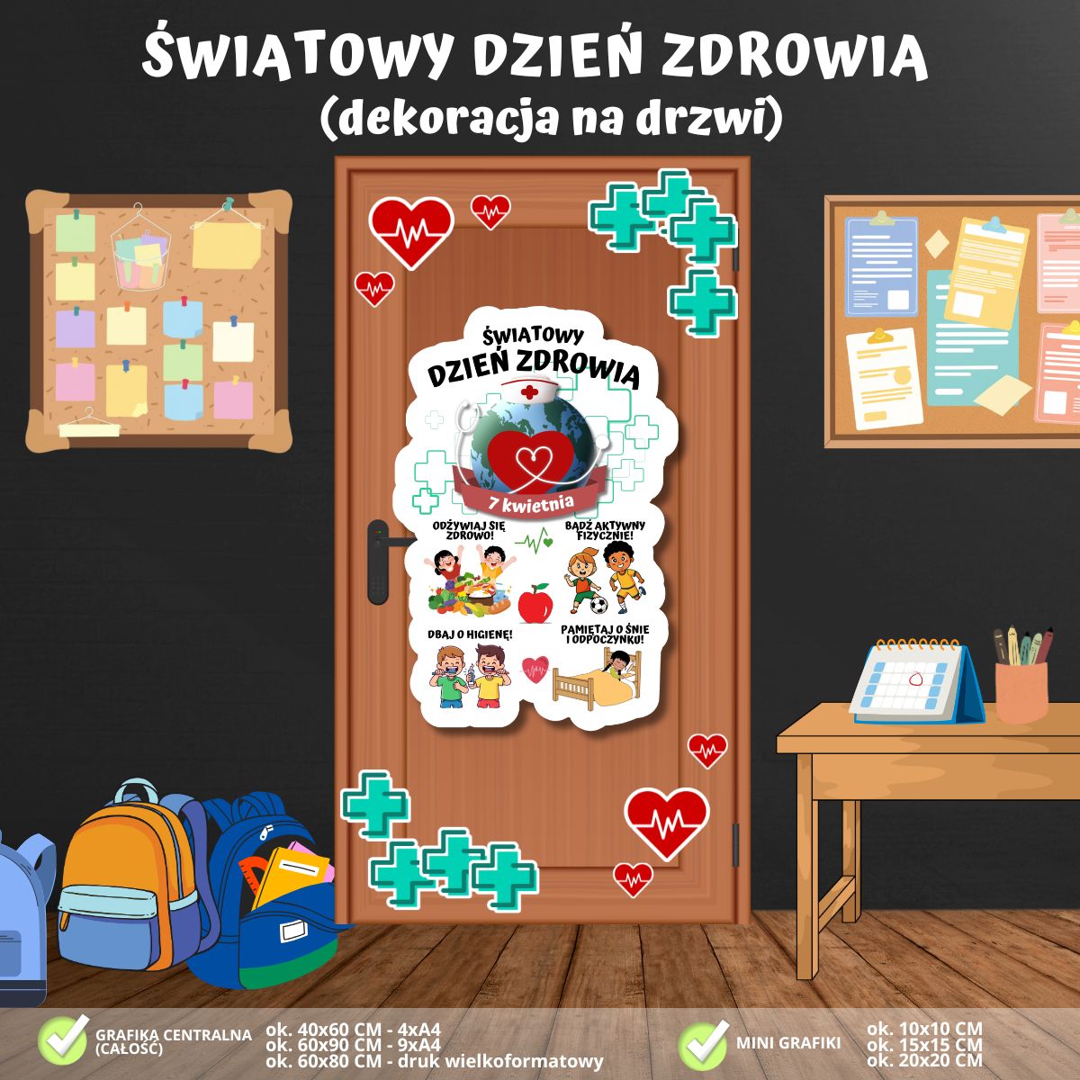 Zadbaj o wyjątkowy i edukacyjny wystrój w swojej klasie! Nasza najnowsza dekoracja na drzwi to połączenie prozdrowotnych nawyków z radosnym przekazem, która wprowadzi uczniów w świat dbania o siebie i zamieni wejście do sali w prawdziwe centrum dobrego samopoczucia: