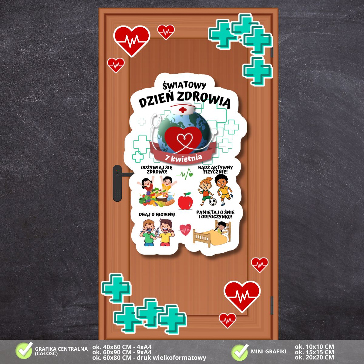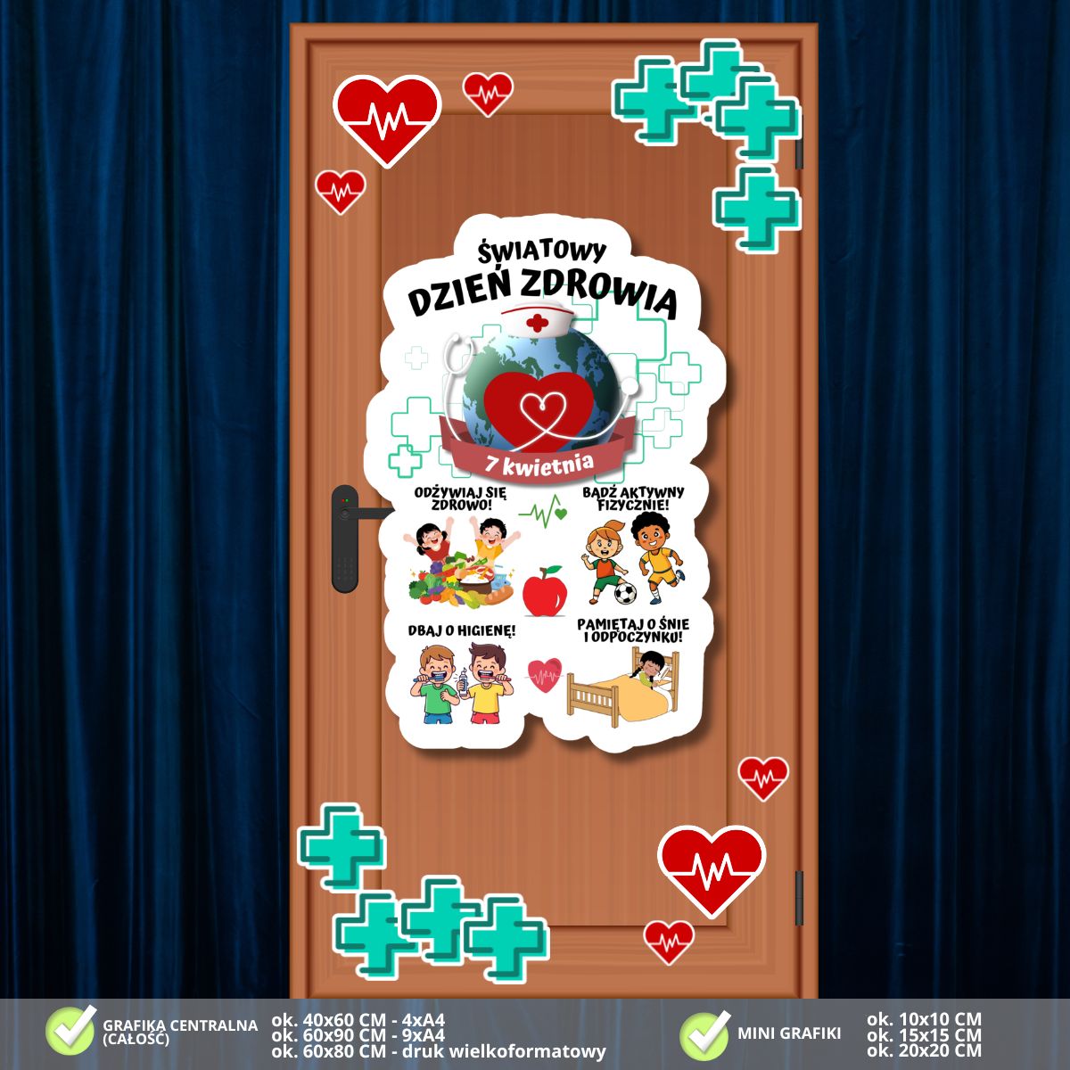 - Elementy dopełniające: Zestaw zawiera bogaty wybór dodatkowych grafik w kształcie serc z linią życia (EKG) oraz miętowych krzyży medycznych. Pozwala to na dowolną aranżację i stworzenie spójnej, medycznej oprawy całych drzwi, podkreślającej troskę o życie i zdrowie.