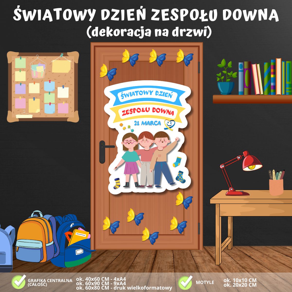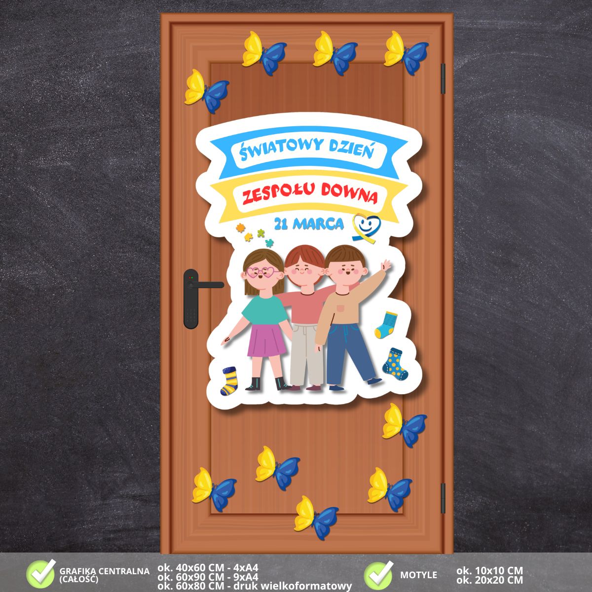 - Wyraźny napis: „Światowy Dzień Zespołu Downa” oraz data „21 marca” umieszczone na dynamicznej grafice, która stanowi czytelny i estetyczny punkt centralny dekoracji.