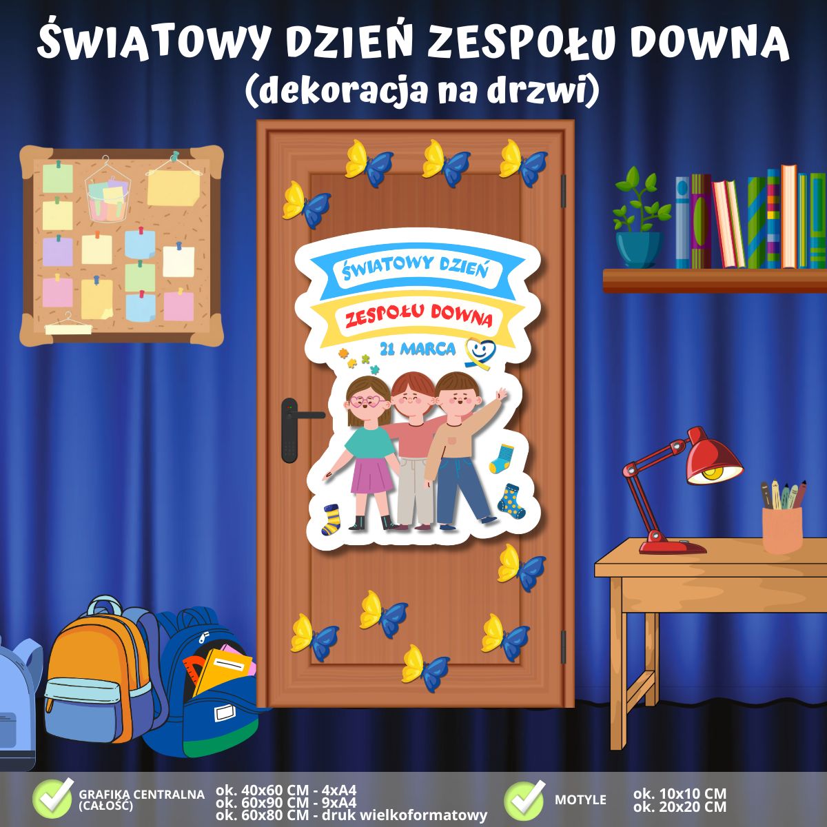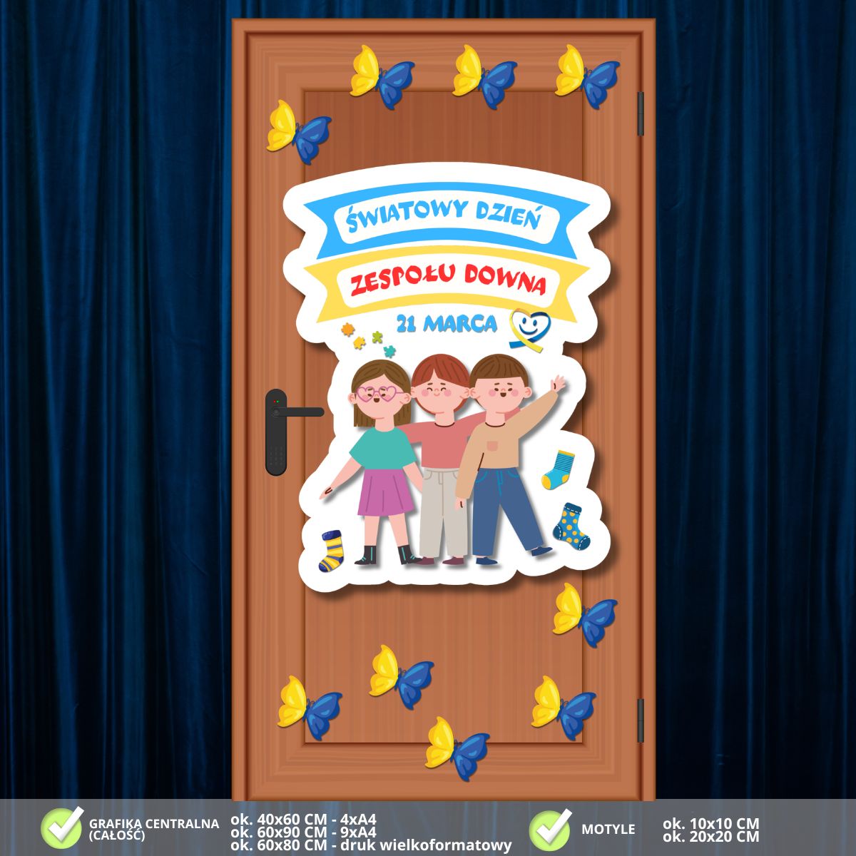 - Elementy dopełniające: Zestaw zawiera dodatkowe grafiki: liczne niebiesko-żółte motyle, które można rozmieścić wokół centralnej grafiki, tworząc spójną i radosną kompozycję na całych drzwiach.