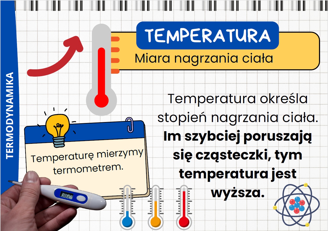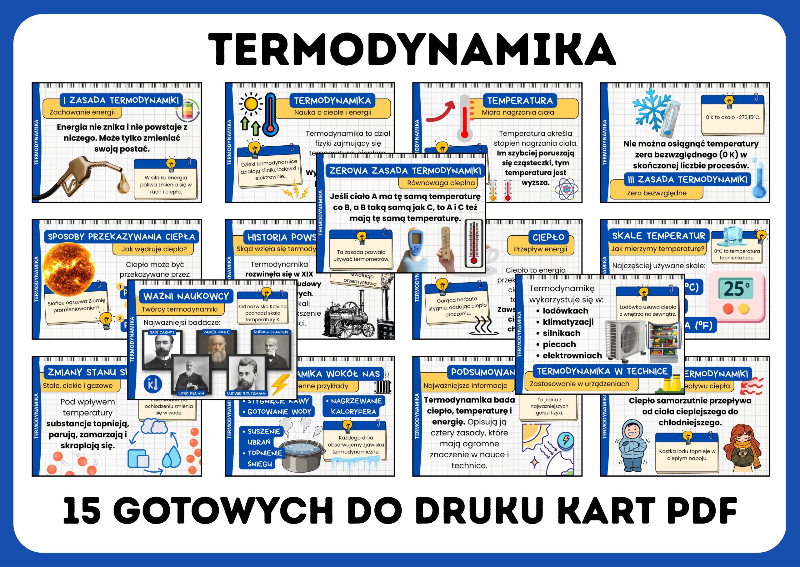 Przygotuj atrakcyjną gazetkę szkolną o termodynamice i pomóż uczniom lepiej zrozumieć jedno z ważnych zagadnień fizyki! Zestaw zawiera aż 15 kart PDF, które w przejrzysty i ciekawy sposób wyjaśniają pojęcia związane z ciepłem, energią i temperaturą.