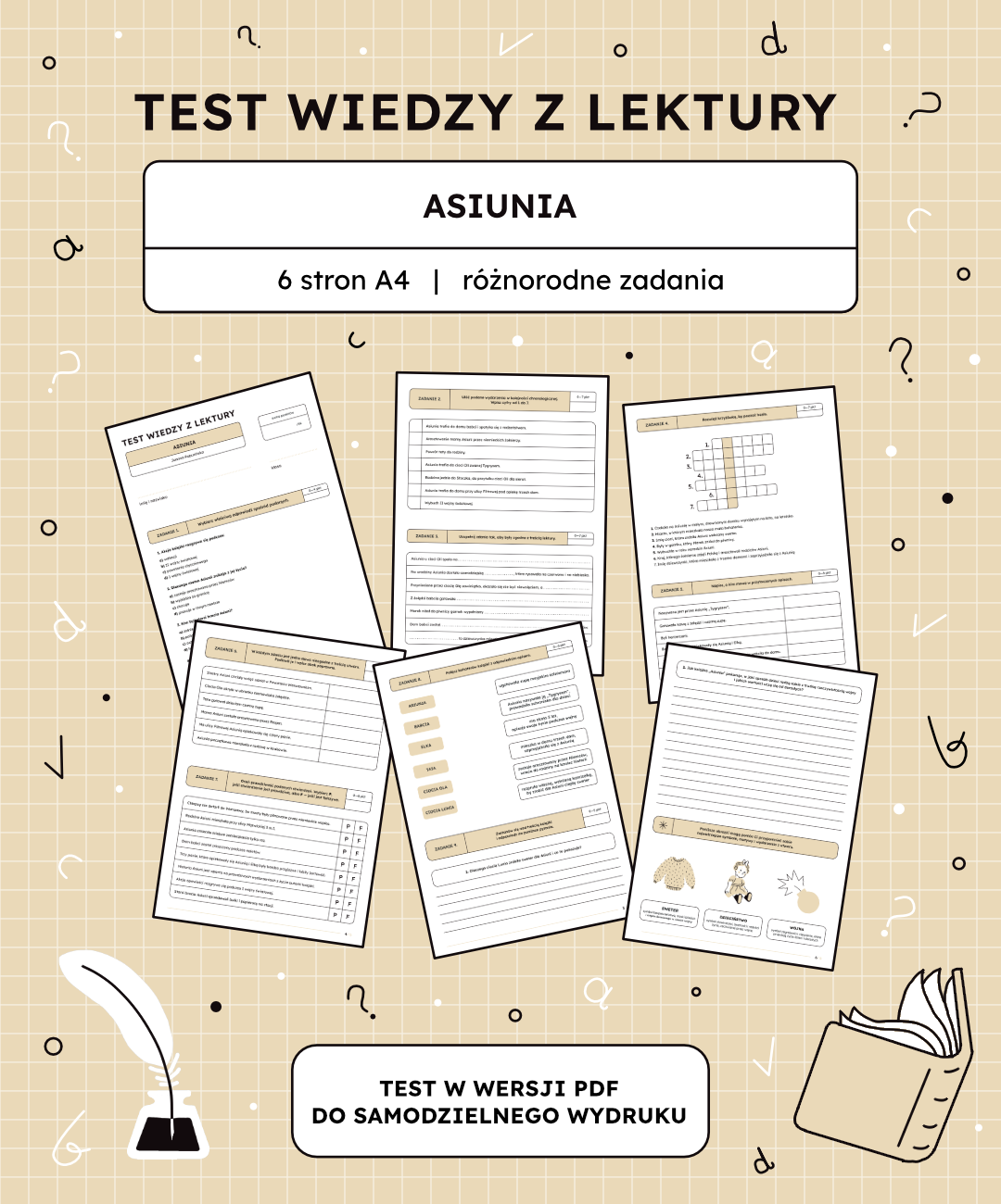 Sprawdzian z lektury „Asiunia” został opracowany w czytelnej, estetycznej formie, sprzyjającej skupieniu i spokojnej pracy na lekcji. Zróżnicowane zadania sprawdzają nie tylko znajomość faktów, ale także rozumienie uczuć, postaw i przesłania utworu.