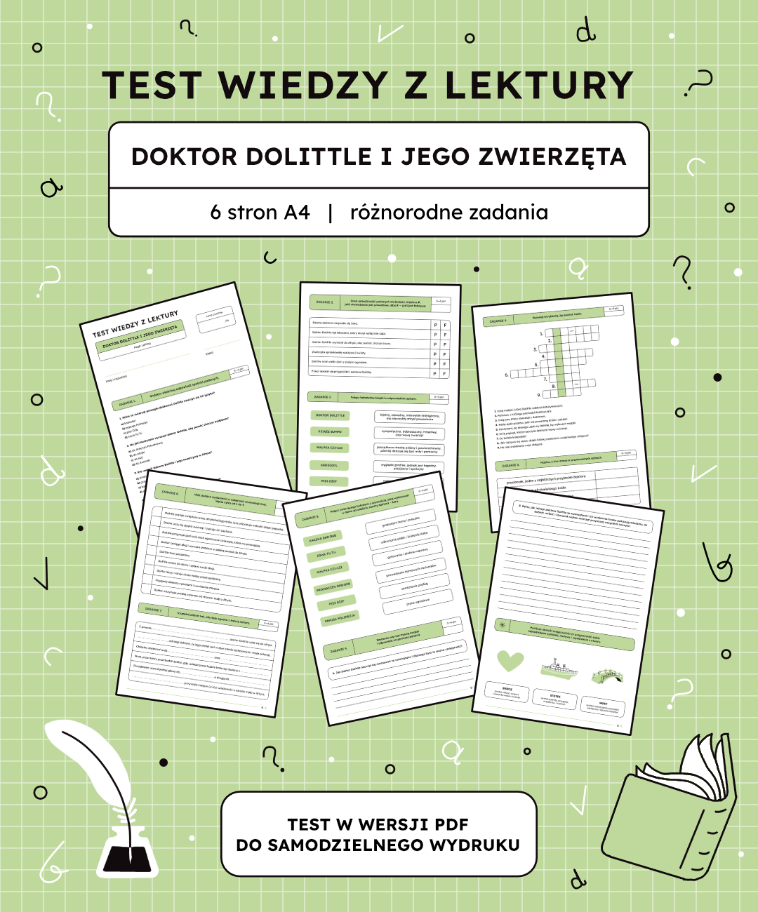 Czeka na Ciebie mój najnowszy test z lektury „Doktor Dolittle i jego zwierzęta”, który składa się z 6 stron A4 w formacie PDF i pozwala w atrakcyjny, a jednocześnie uporządkowany sposób sprawdzić wiedzę uczniów. Pytania dotyczą fabuły, bohaterów oraz niezwykłych przygód doktora potrafiącego rozmawiać ze zwierzętami.