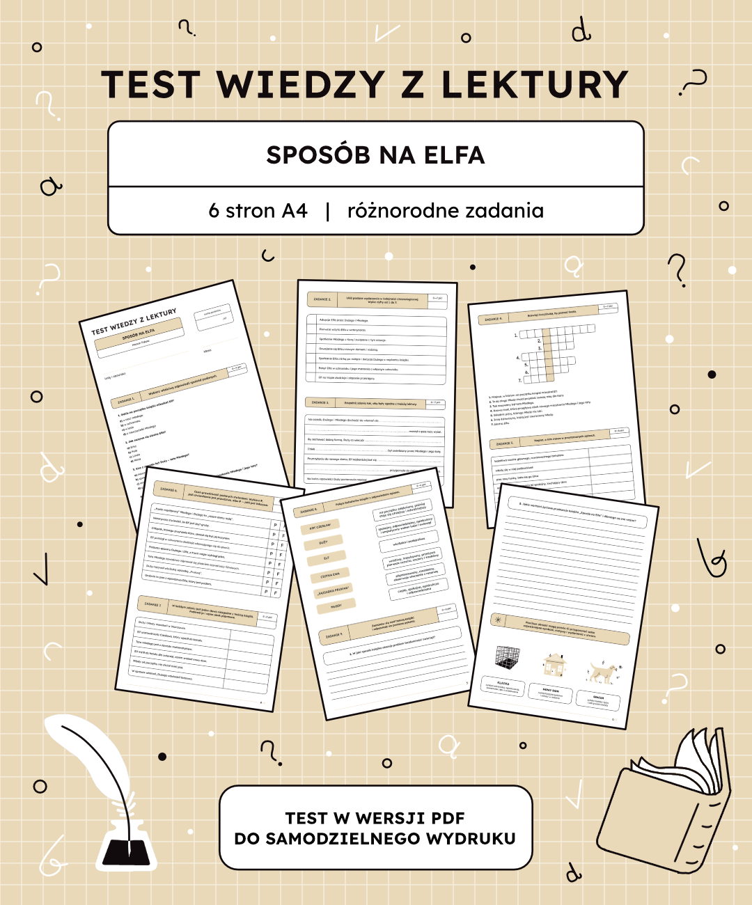 Test z lektury „Sposób na Elfa” autorstwa Marcin Pałasz to aż 6 stron A4 w formacie PDF, przygotowanych w przejrzystej, estetycznej i gotowej do druku wersji. Sprawdzian pozwala kompleksowo zweryfikować znajomość treści książki, bohaterów, wydarzeń oraz zrozumienie przesłania utworu.