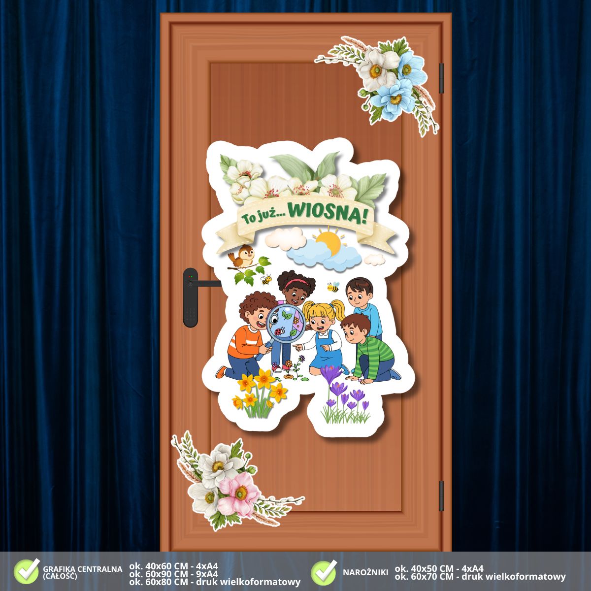- Elementy dopełniające: Zestaw zawiera dodatkowe grafiki: przepiękne bukiety wiosennych kwiatów, które można rozmieścić wokół centralnej grafiki, tworząc spójną i radosną kompozycję na całych drzwiach.