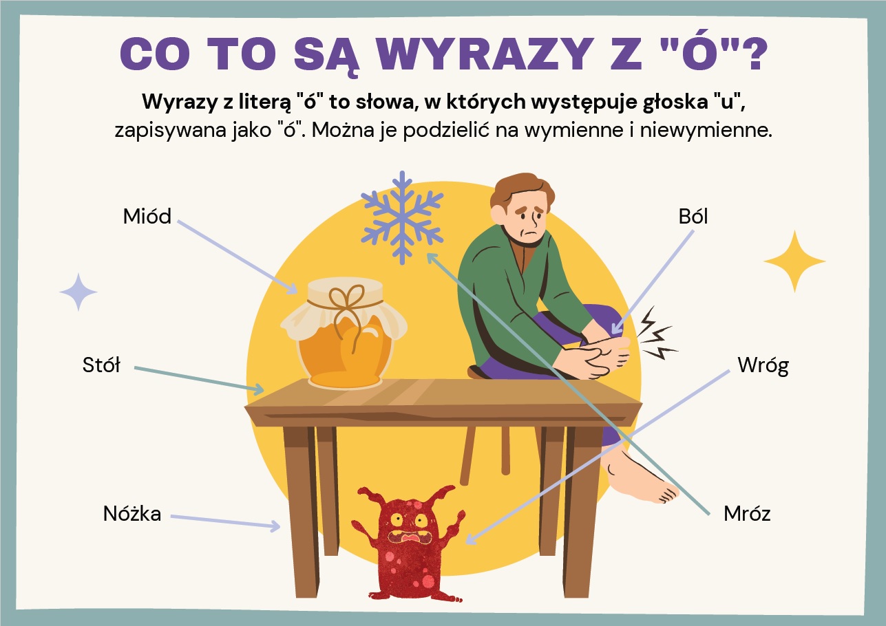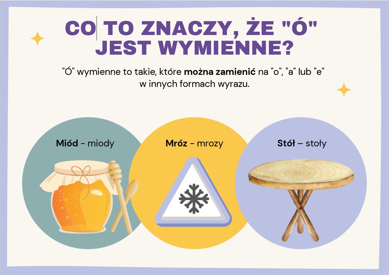 Wyrazy z „ó” wymiennym to takie, w których „ó” można wymienić na „o” w wyrazie pokrewnym lub odmienionej formie, np. stół – stoły, wóz – wozu. Dzięki temu łatwiej zapamiętać pisownię.