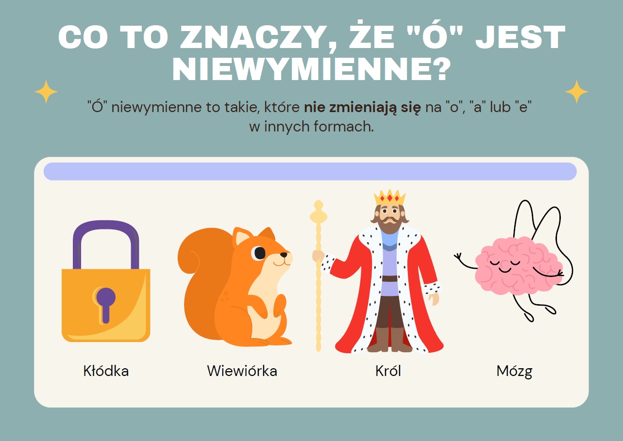 Wyrazy z „ó” niewymiennym to takie, w których „ó” nie da się wymienić na „o” w żadnej formie wyrazu, np. król, bór, pióro. W takich przypadkach pisownię trzeba zapamiętać lub sprawdzić w słowniku.