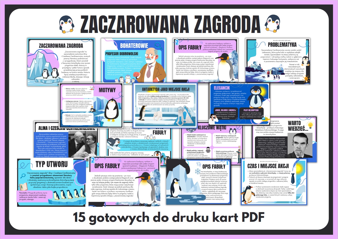 📘 Zaczarowana zagroda – gazetka szkolna (15 kart PDF). Przygotuj atrakcyjną i edukacyjną gazetkę szkolną, która przeniesie uczniów w niezwykły, lodowy świat Antarktydy ❄️🐧 Nasza gazetka w ciekawy sposób przybliża treść książki, jej bohaterów oraz fascynujące życie pingwinów.