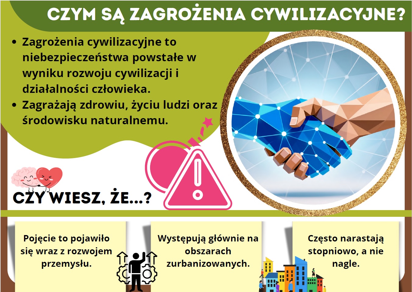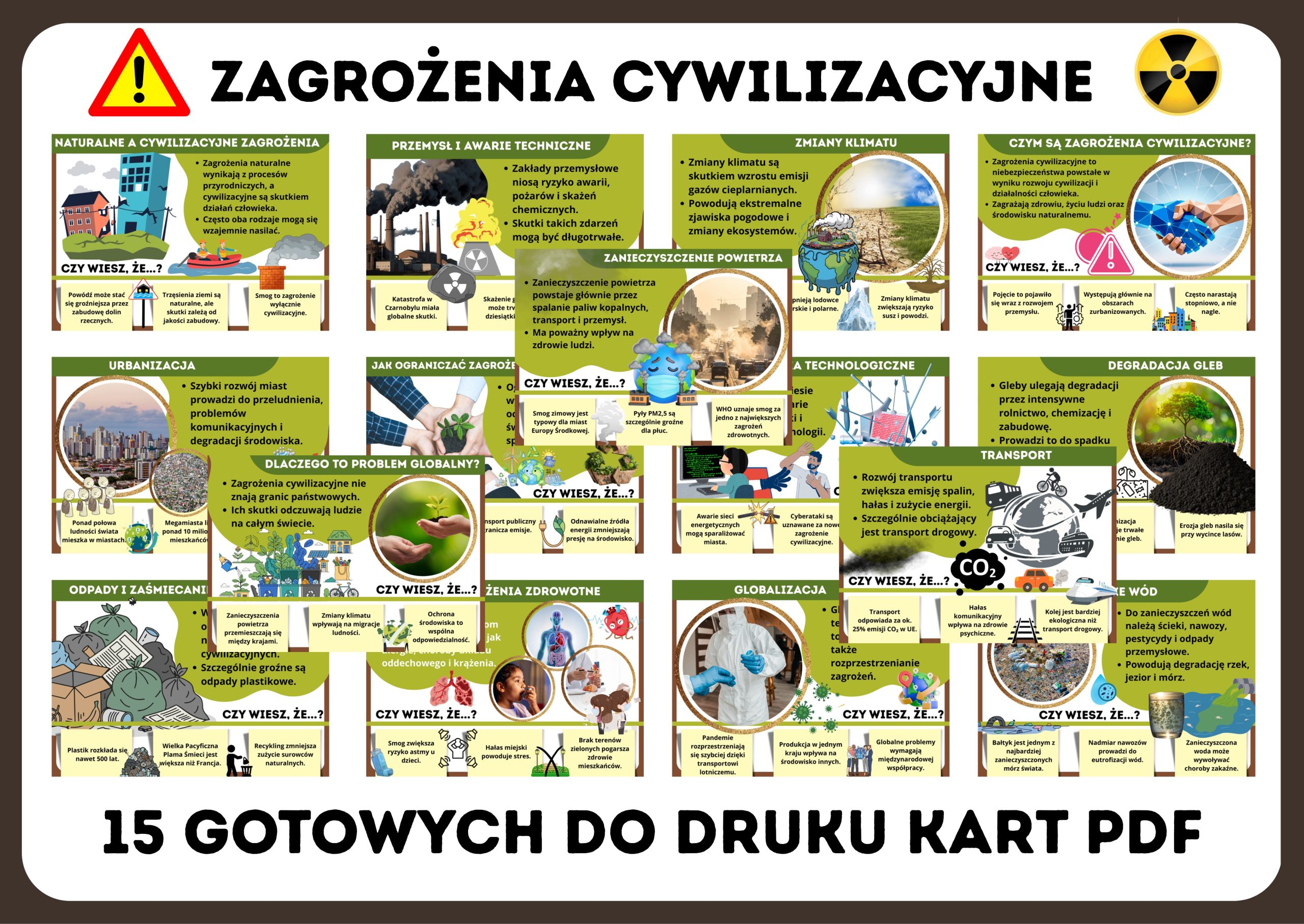 Zagrożenia cywilizacyjne – edukacyjna gazetka szkolna (15 kart PDF). Nowoczesna i angażująca gazetka szkolna poświęcona zagrożeniom cywilizacyjnym, które realnie wpływają na życie młodych ludzi i całego społeczeństwa. Zestaw aż 15 kart PDF w przystępny sposób porusza tematy takie jak zanieczyszczenie środowiska, zmiany klimatu, uzależnienia, choroby cywilizacyjne czy zagrożenia cyfrowe.